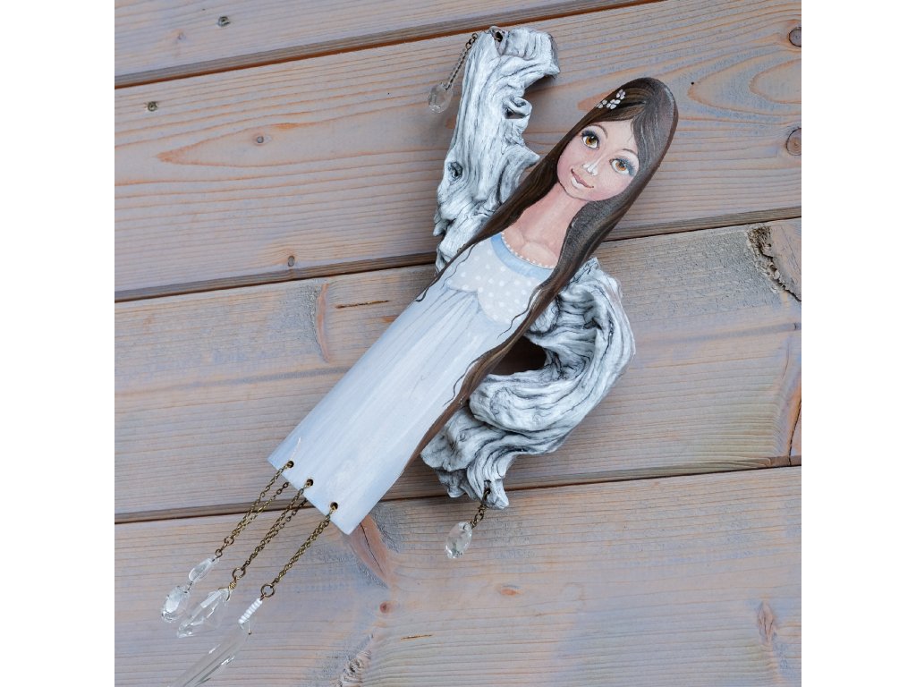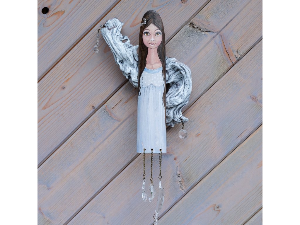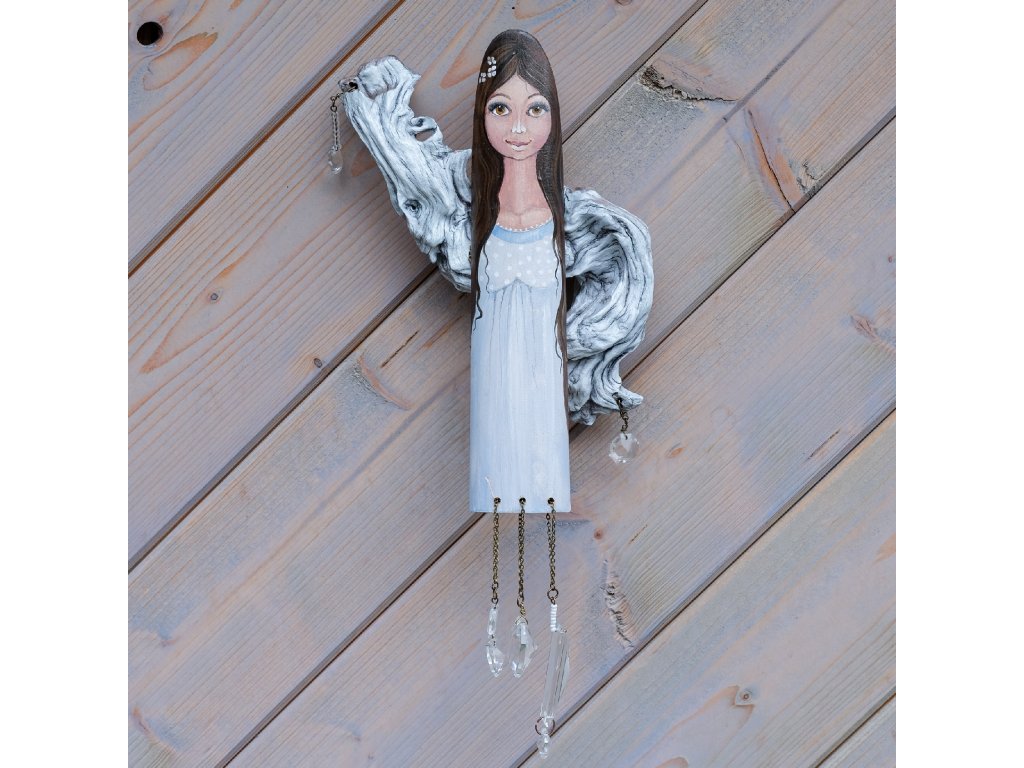 Velká originální andělka malovaná olejovými barvami, křídla má z krásného tvrdého dřeva, pečlivě vybraného . Ozdobená je českým křištálem a skleněnými korálky.