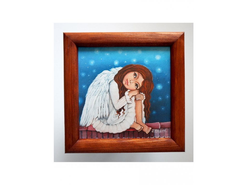 Obrázek je velký 13,5 x 13,5 cm, rámovaný v jednoduchém dřevěném rámečku.
