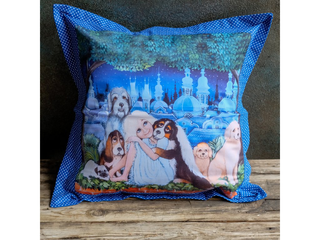 Polštář je ušitá z mé látky kterou jsem si nechala vytisknout. Velikost obrázku je 40 x40 cm okolo je ozdobný okraj z amerických designových látek. Přední strana je podložená termolínem. Potah na zip.