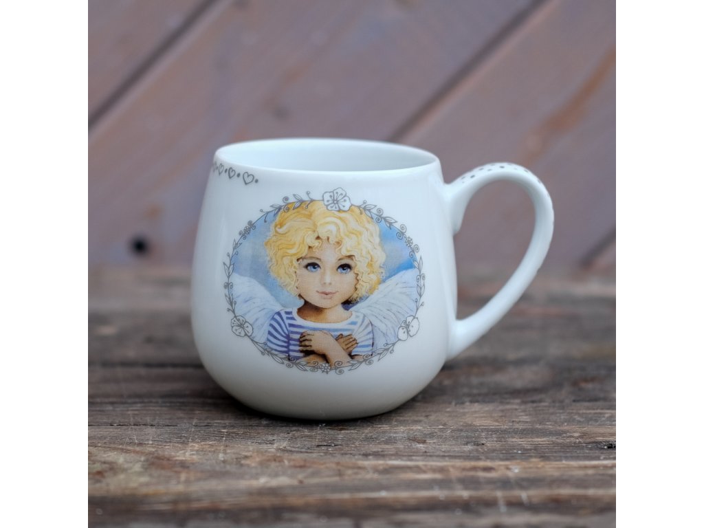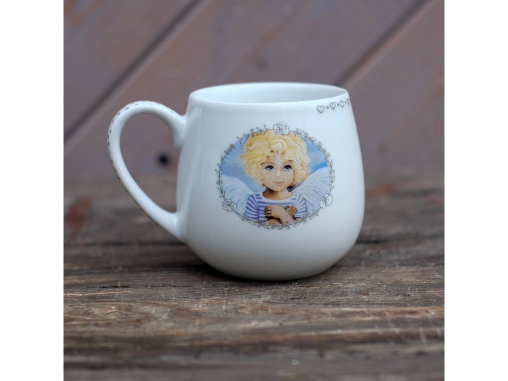 takový milý hrnek, (mi připadá ) s mým obrázkem a dekorovaný drobnými puntíky. Vypáleno na vysokou teplotu 780 - 800 stupňů. Na spodní straně autorská značka. Andělka a kočičky byl dlouho vyprodaný - teď je nově vyrobený a myslím, že je krásný.