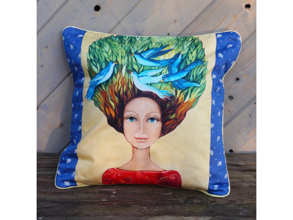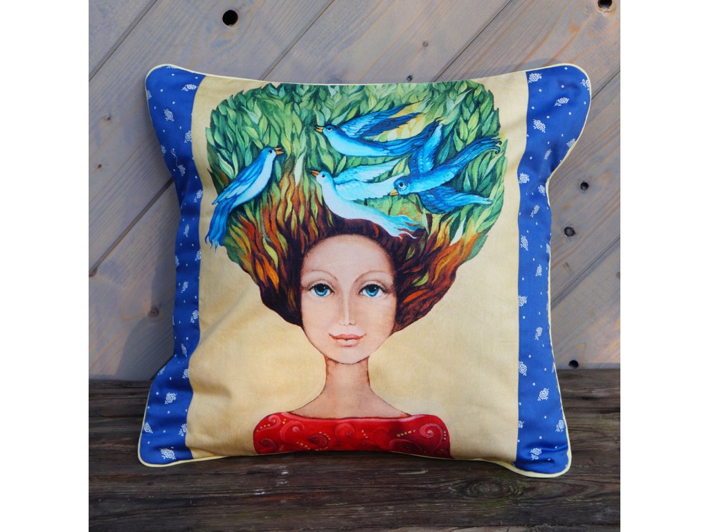 ze zadní strany bavlna barevně ladící s obrázkem. Kvalitní náplň -duté vlákno. Prát na 40 stupňů.