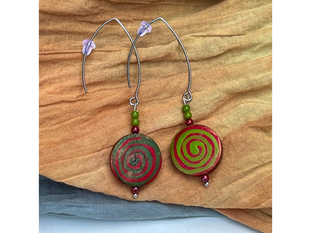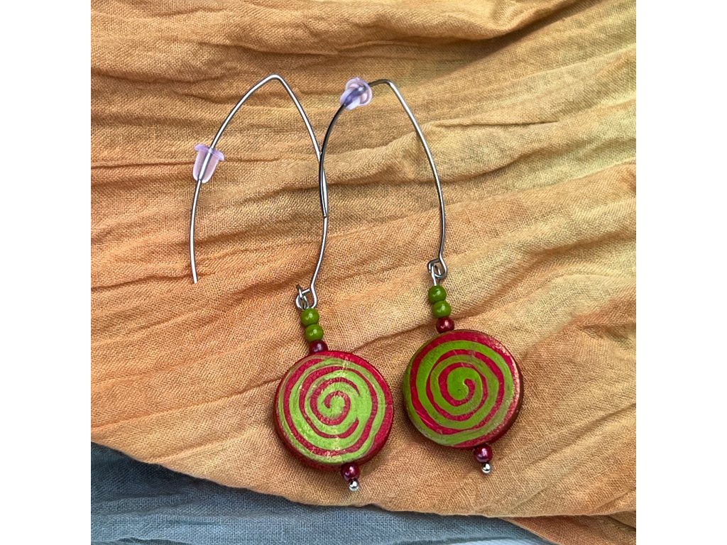 Zajímavé moderní dřevěné malované náušnice. Náušnicový háček. chirurgická ocel v uchu nezlobí.