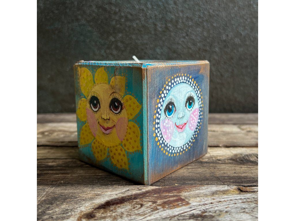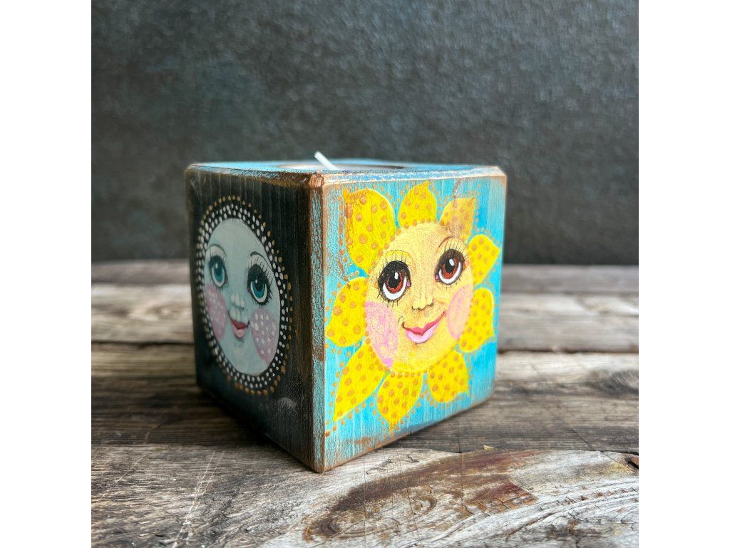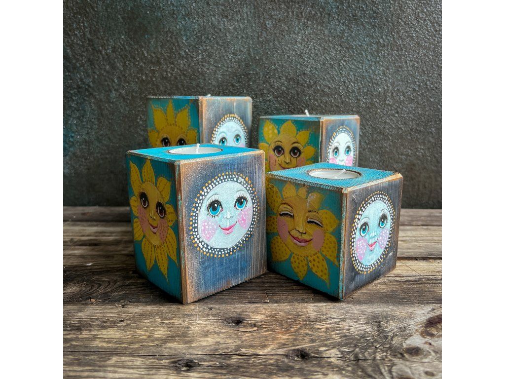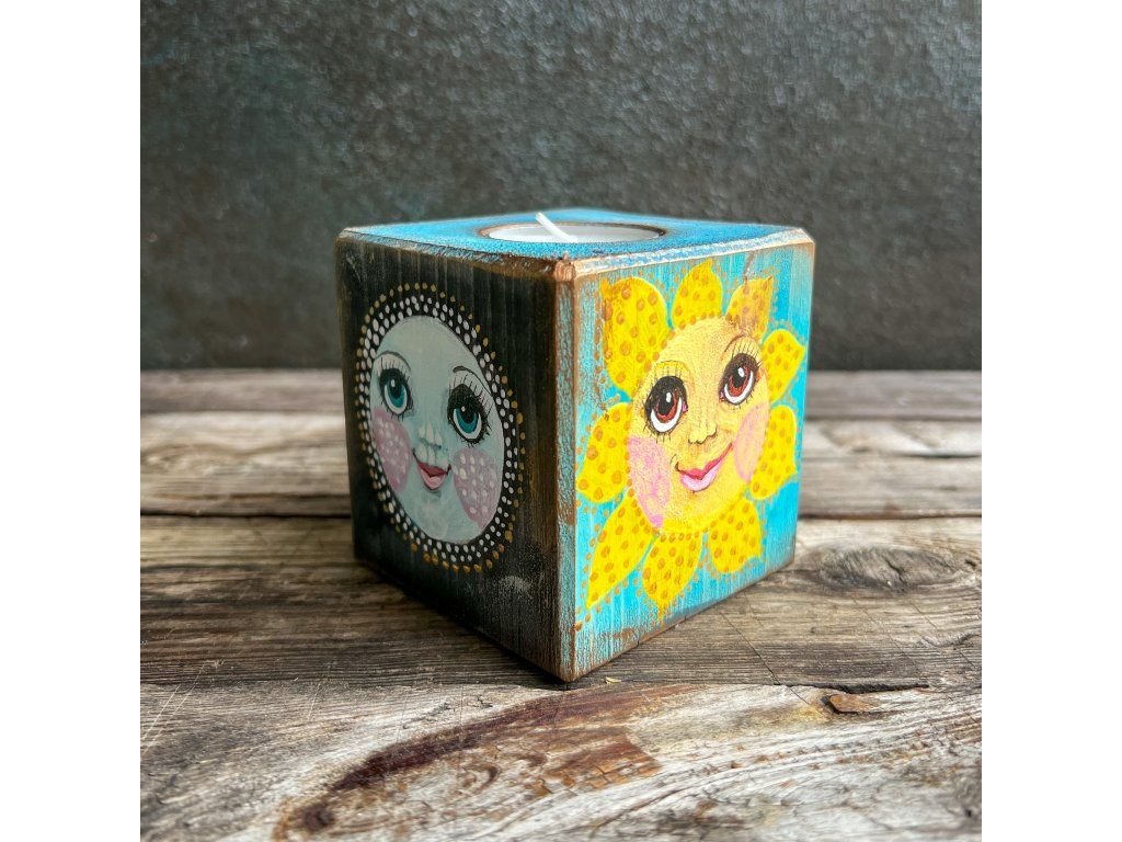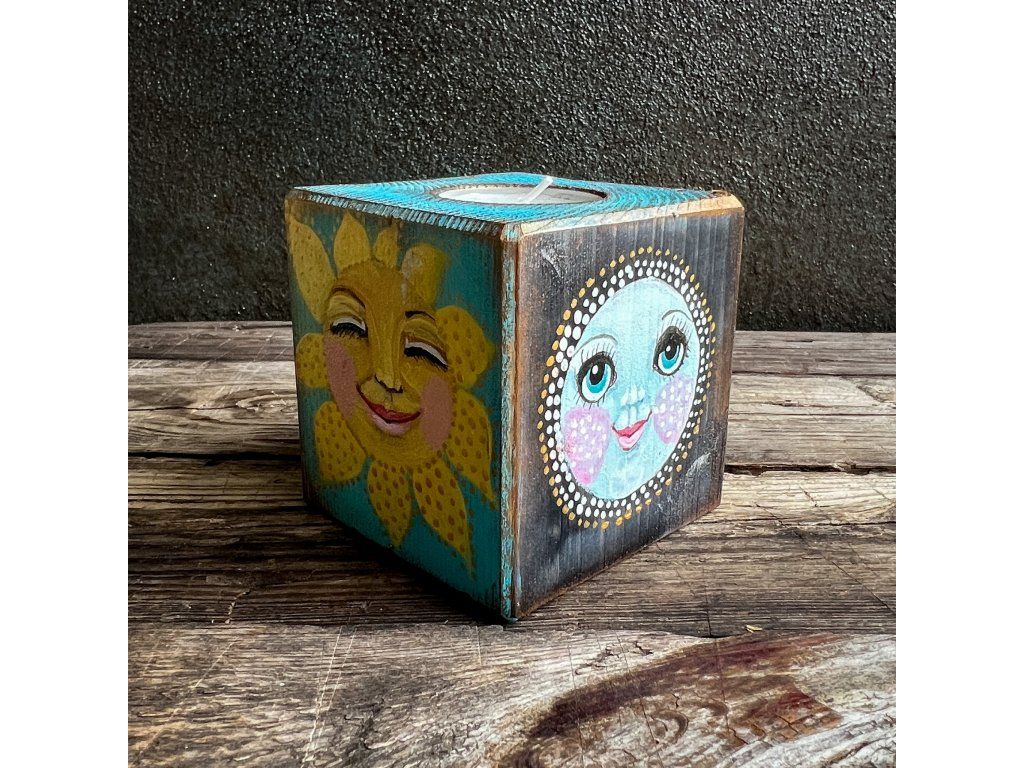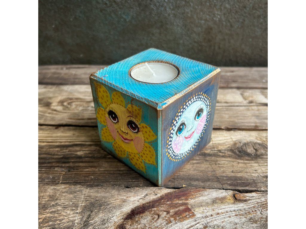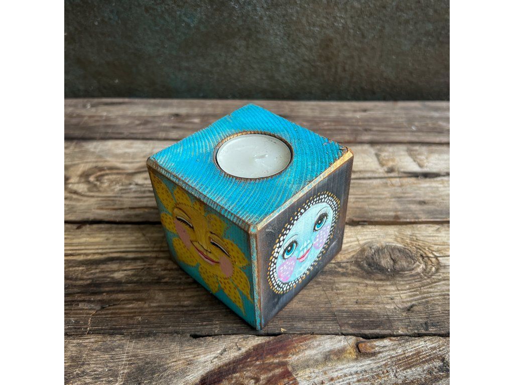 Dřevěný svícen s miskou na čajovou svíčku,malovaný, patinovaný, na závěř pečlivě zalakovaný.