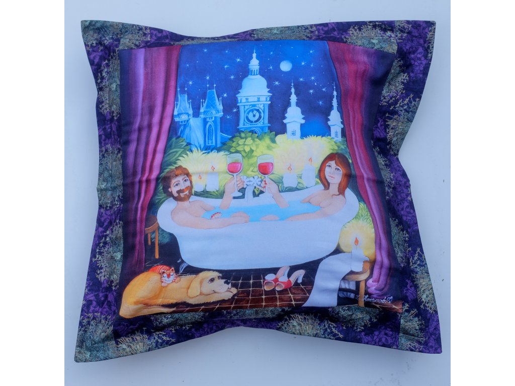 Polštář je ušitá z mé látky kterou jsem si nechala vytisknout. Velikost obrázku je 40 x40 cm okolo je ozdobný okraj z amerických designových látek. Přední strana je podložená termolínem. Potah na zip.