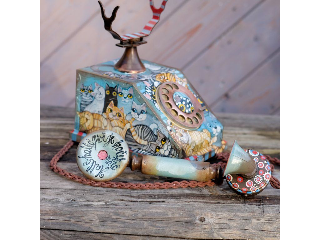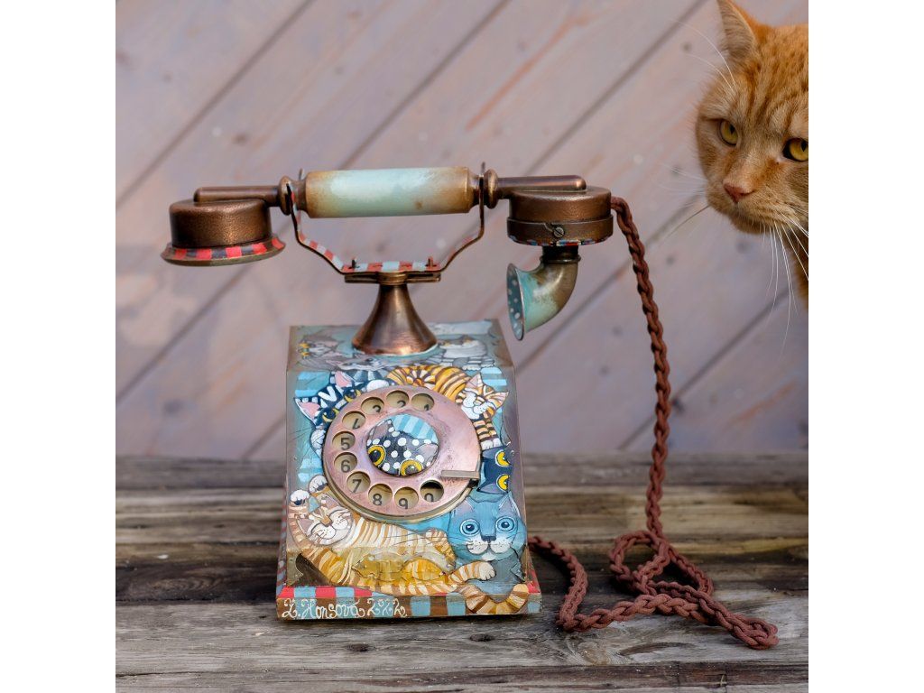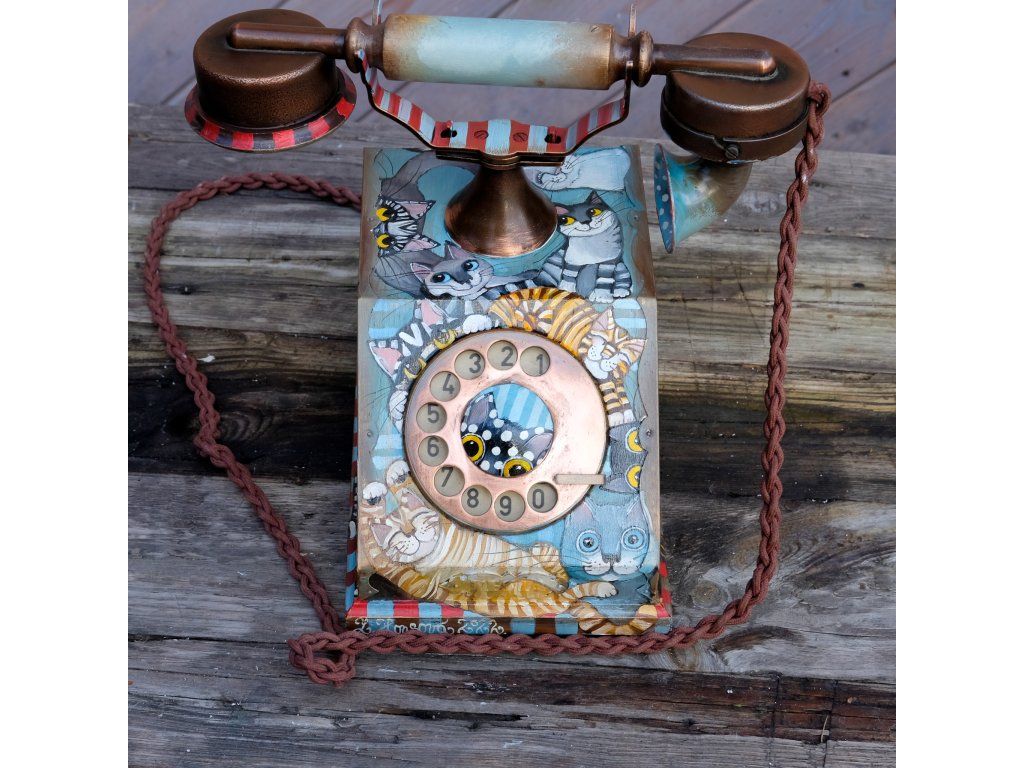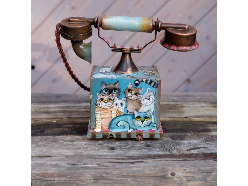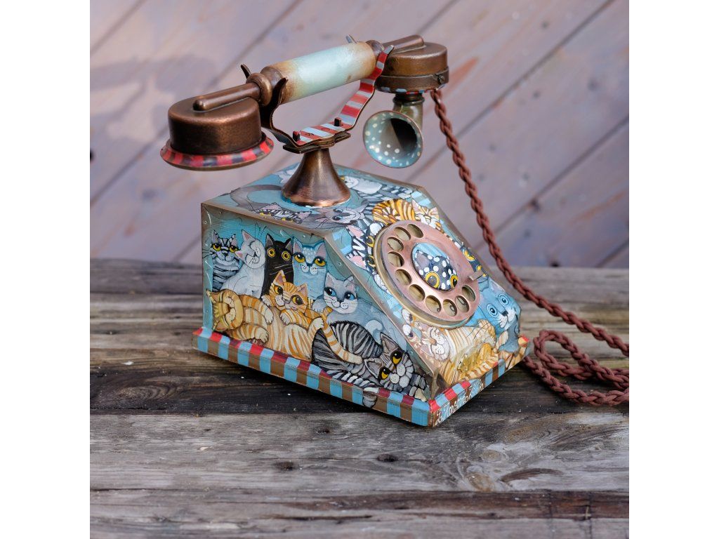 Novinka jedna jediná a vzácná. Telefon jsem koupila již před mnoha lety a nenašla odvahu ho pomalovat.. Je krásný dřevěný a měděný. Kočky kam se podíváš.