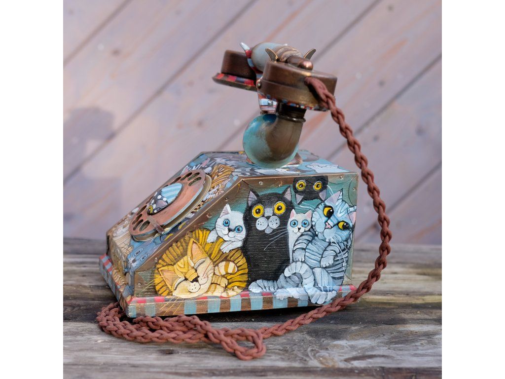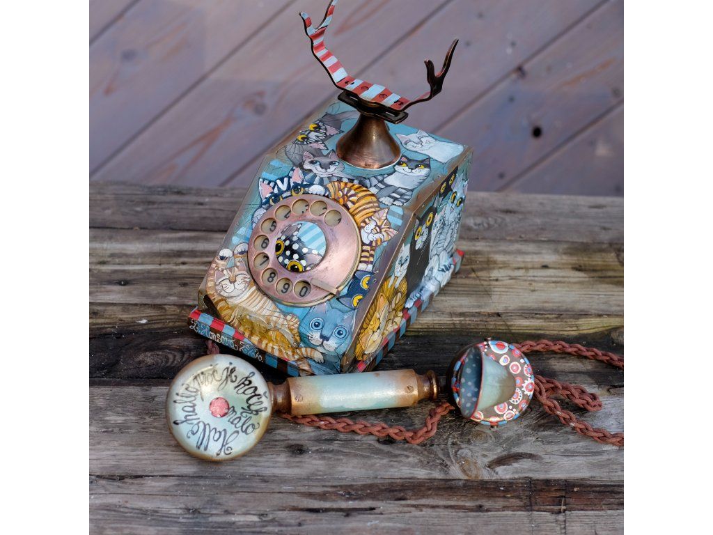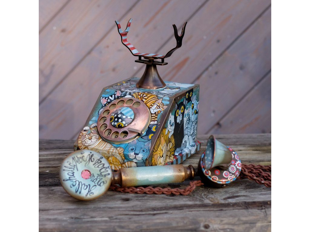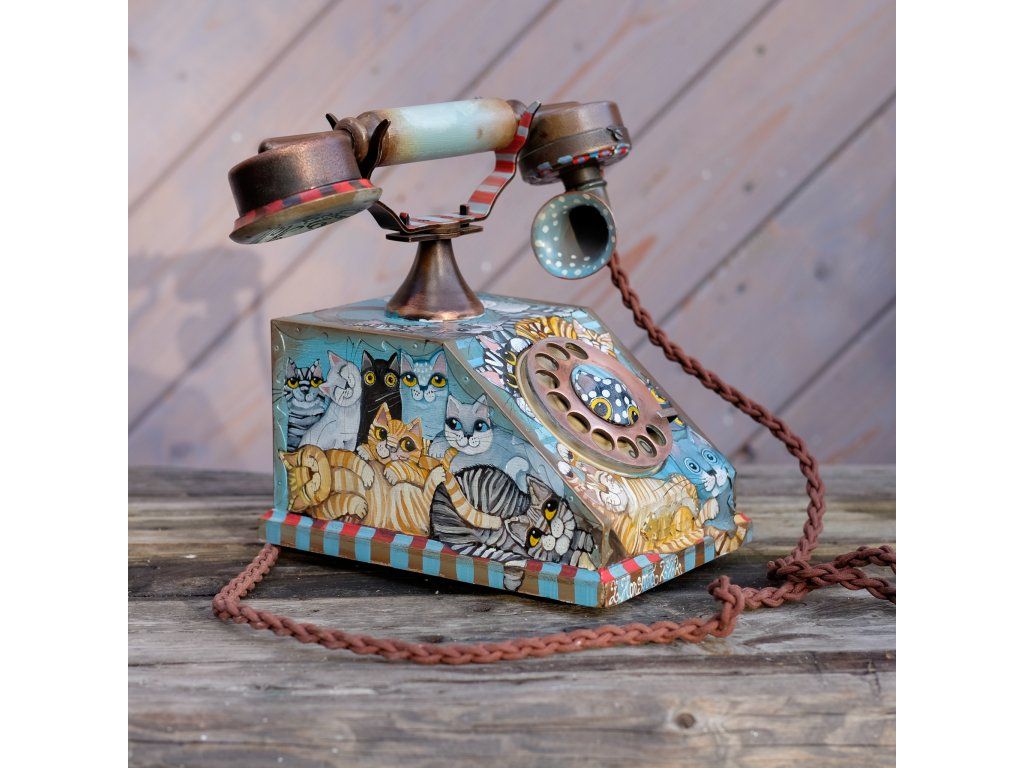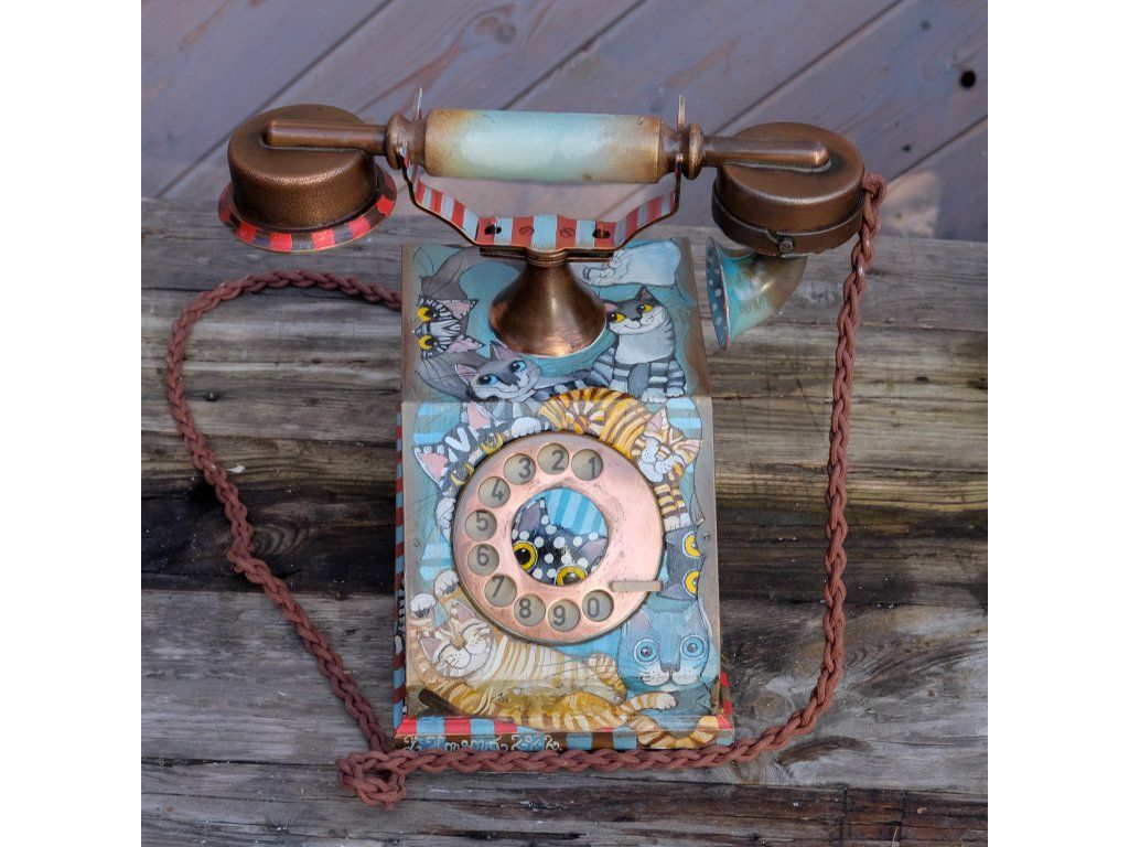 Novinka jedna jediná a vzácná. Telefon jsem koupila již před mnoha lety a nenašla odvahu ho pomalovat.. Je krásný dřevěný a měděný. Kočky kam se podíváš.