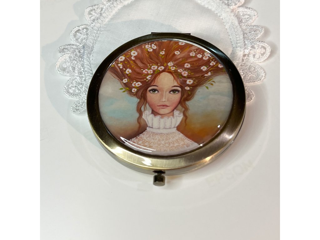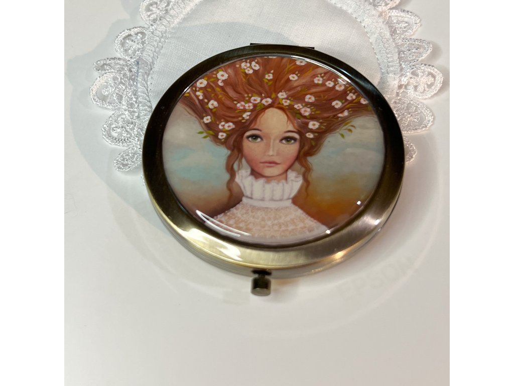 Otevírací zrcátko velké 70 mm. Uvnitř jsou dvě zrcátka, jedno je klasické a druhé zvětšovací. nahoře je můj obrázek chráněný pružnou čočkou.