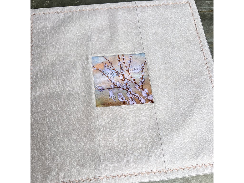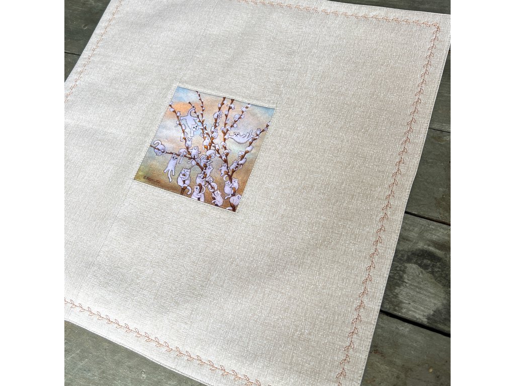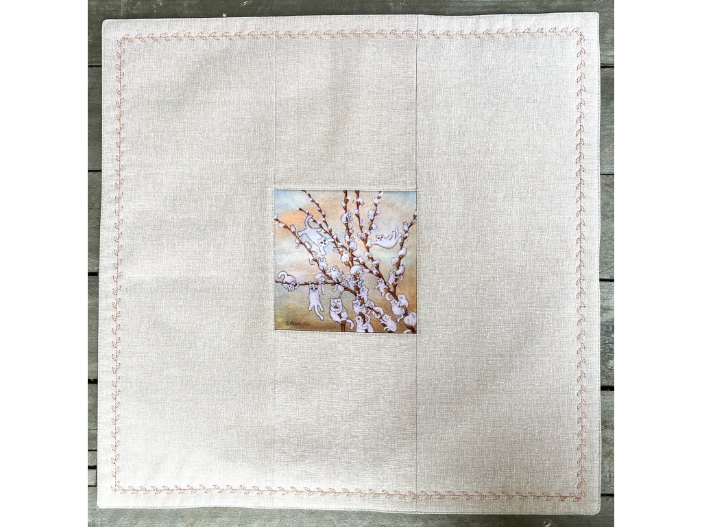 Krásný středový ubrus s obrázkem kočiček a vyšíváním. Celý je vyztužený a podložený.