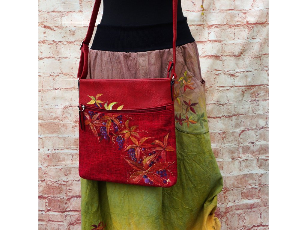 Kabelka částečně textilní, částečně eko kůže - z jedné strany pomalovaná . jedna kapsa na zip z druhé strany. Uvnitř jedna kapsa na zip plus dvě kapsy otevřené, kabelka je celá na zip.