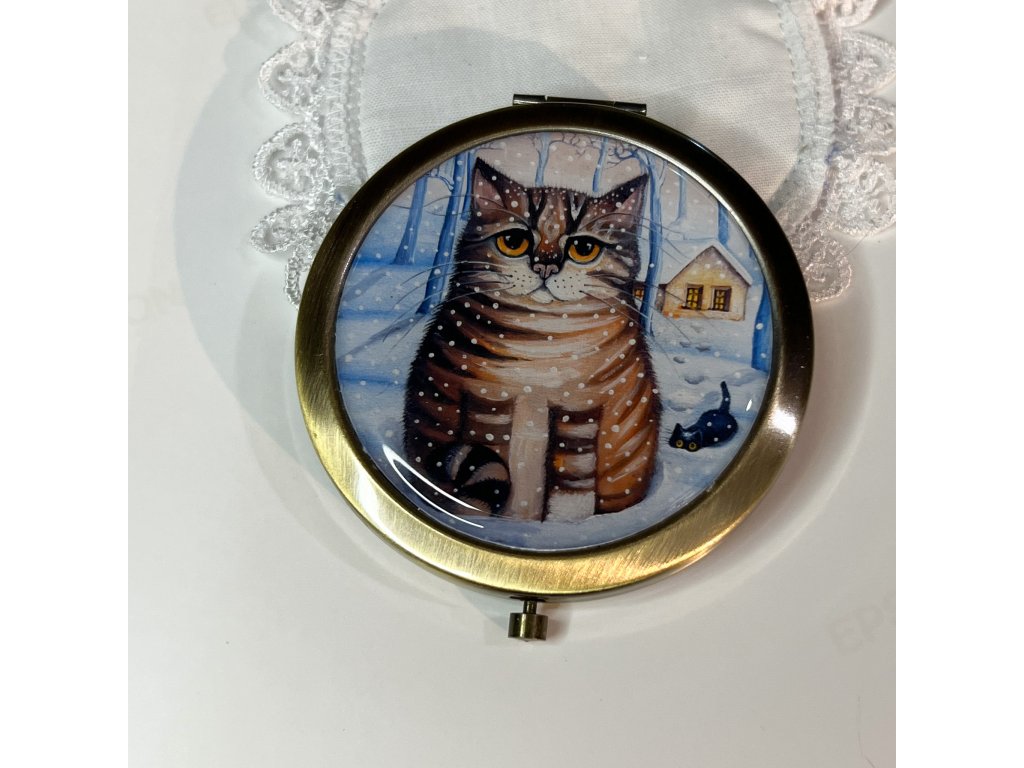 Otevírací zrcátko velké 70 mm. Uvnitř jsou dvě zrcátka, jedno je klasické a druhé zvětšovací. nahoře je můj obrázek chráněný pružnou čočkou.