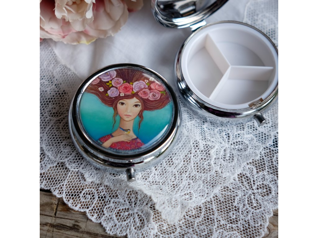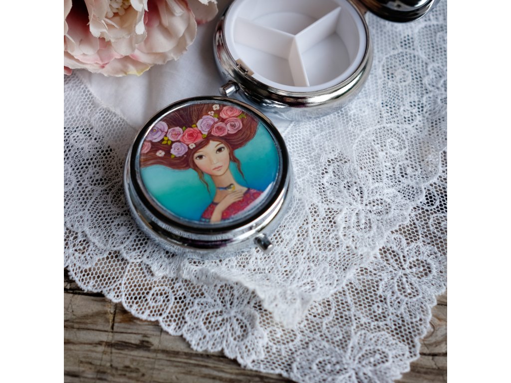 Milá krabiččka , lékovka s obrázkem ..na léky na vitamíny .. do kabelky -milá praktická drobnost která potěší...V organzovém pytlíčku.
