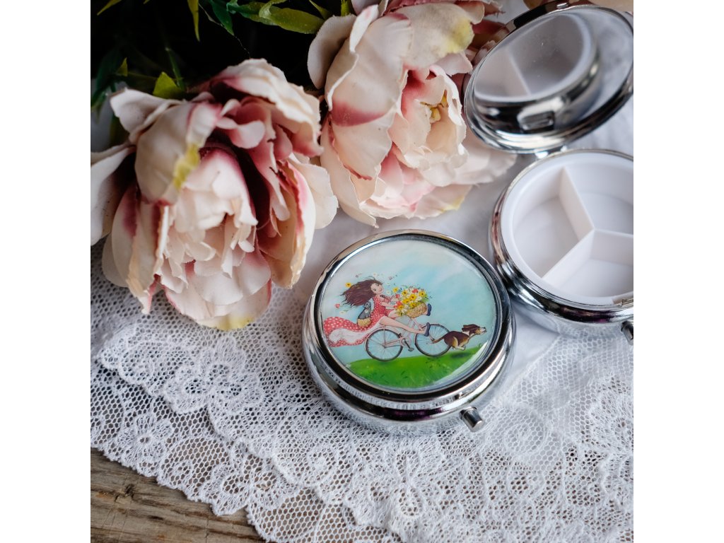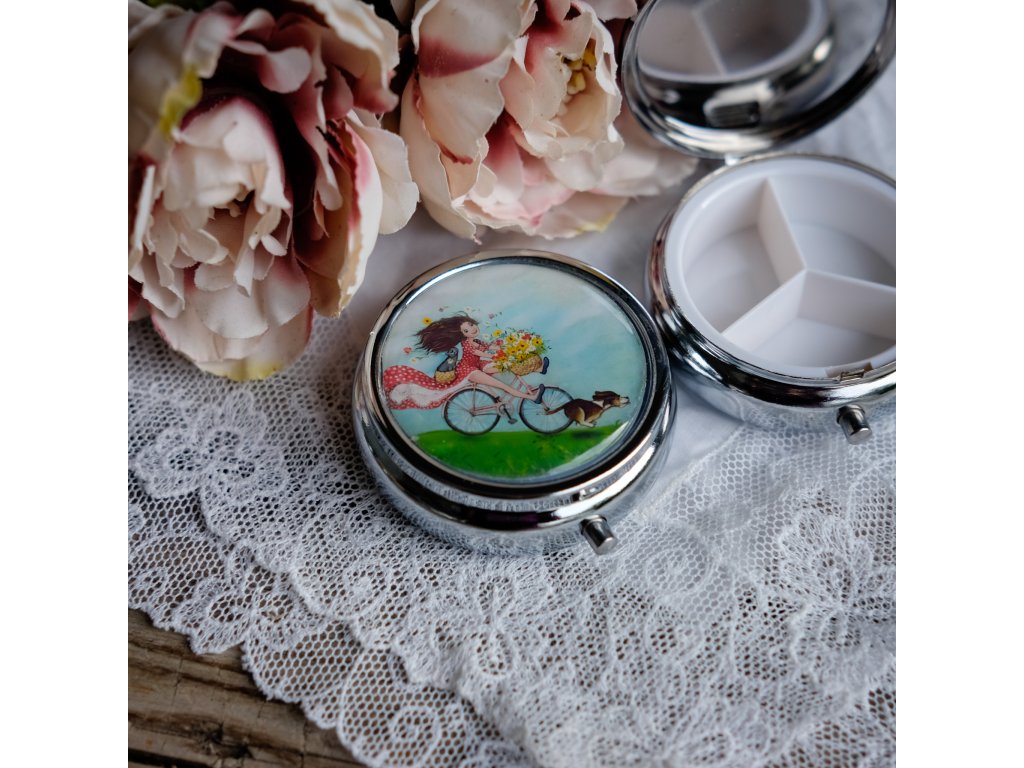 Milá krabiččka , lékovka s obrázkem ..na léky na vitamíny .. do kabelky -milá praktická drobnost která potěší...V organzovém pytlíčku.