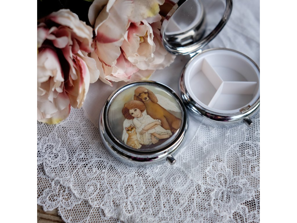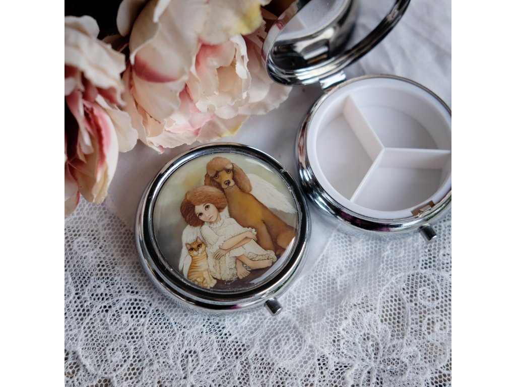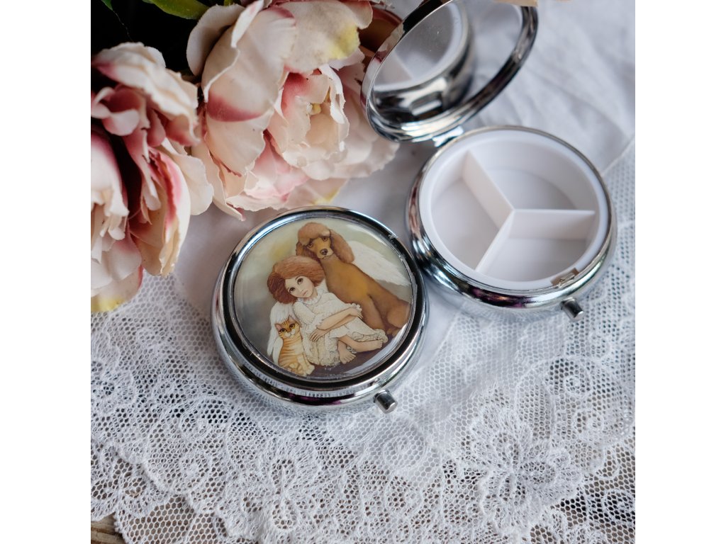 Milá krabiččka , lékovka s obrázkem ..na léky na vitamíny .. do kabelky -milá praktická drobnost která potěší...V organzovém pytlíčku.