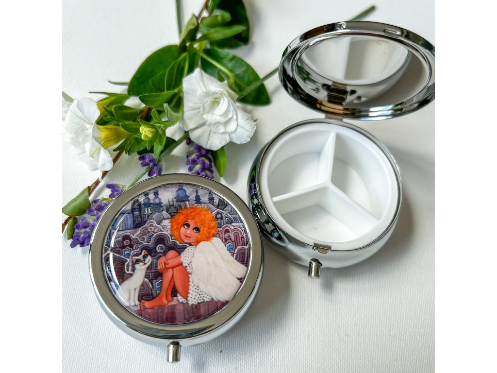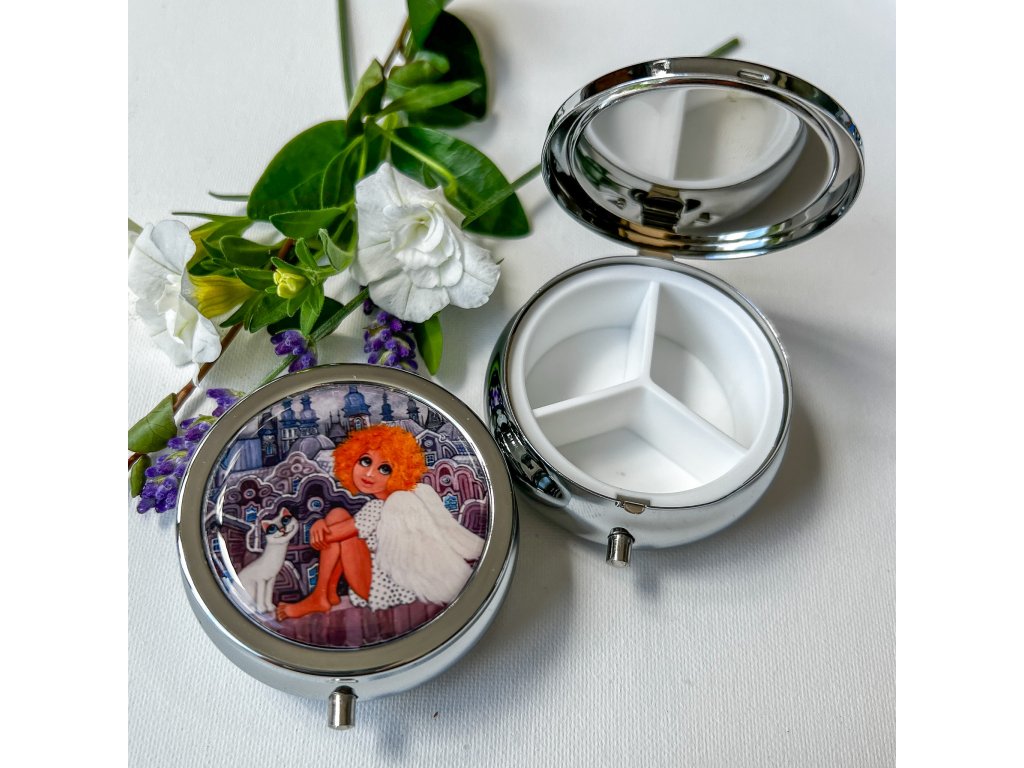 Milá krabiččka , lékovka s obrázkem ..na léky na vitamíny .. do kabelky -milá praktická drobnost která potěší...V organzovém pytlíčku.