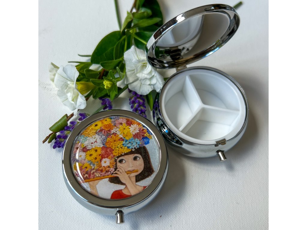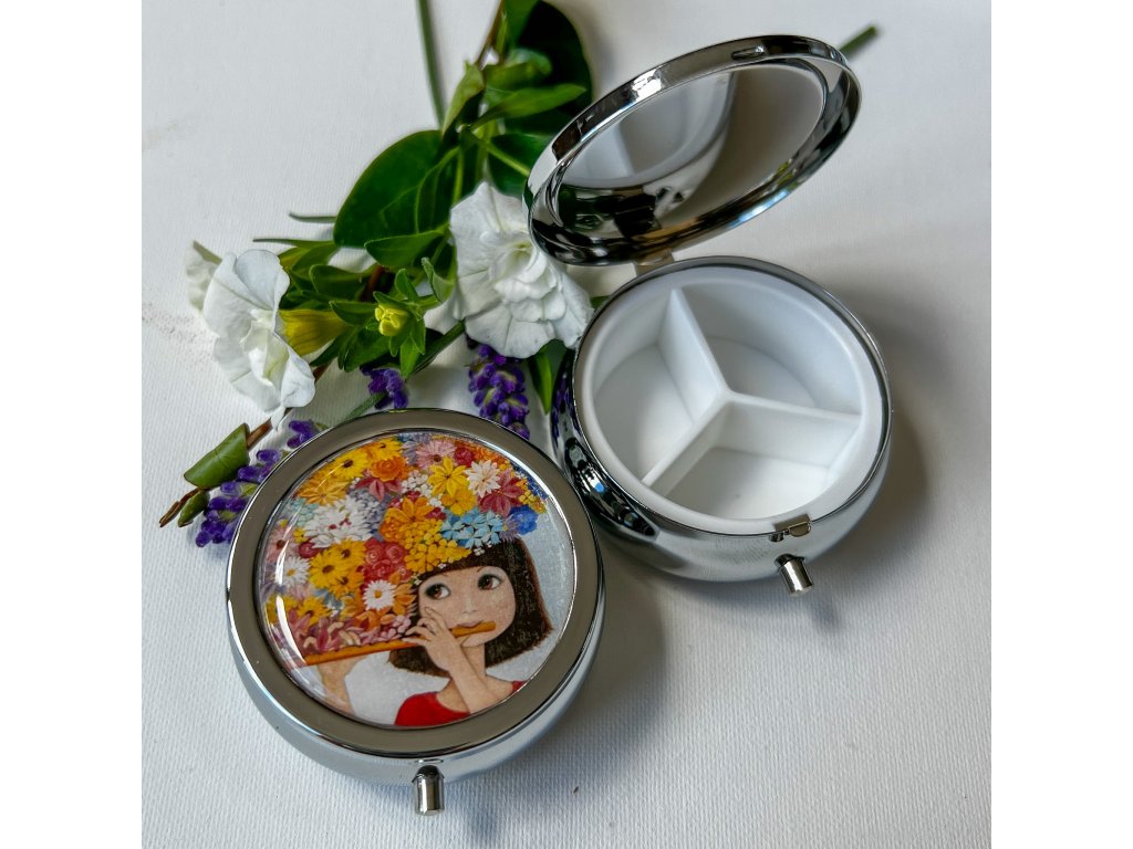 Milá krabiččka , lékovka s obrázkem ..na léky na vitamíny .. do kabelky -milá praktická drobnost která potěší...V organzovém pytlíčku.