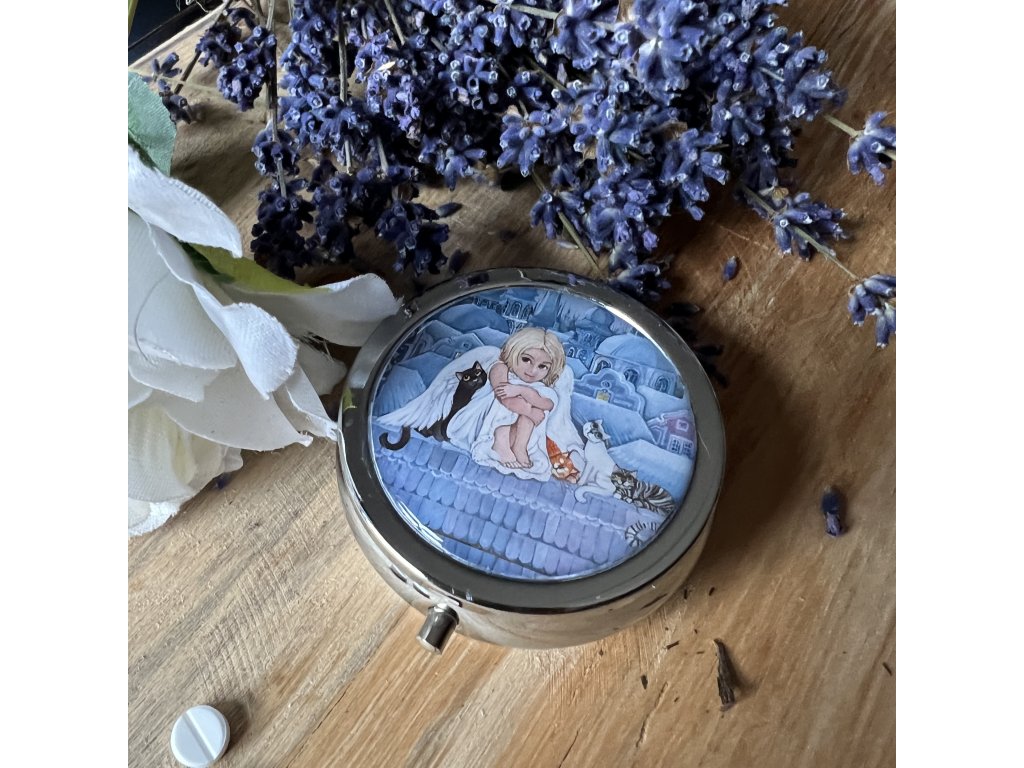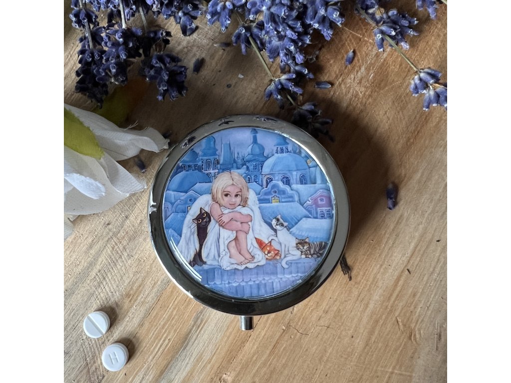 Milá krabiččka , lékovka s obrázkem ..na léky na vitamíny .. do kabelky - milá praktická drobnost která potěší...V organzovém pytlíčku.