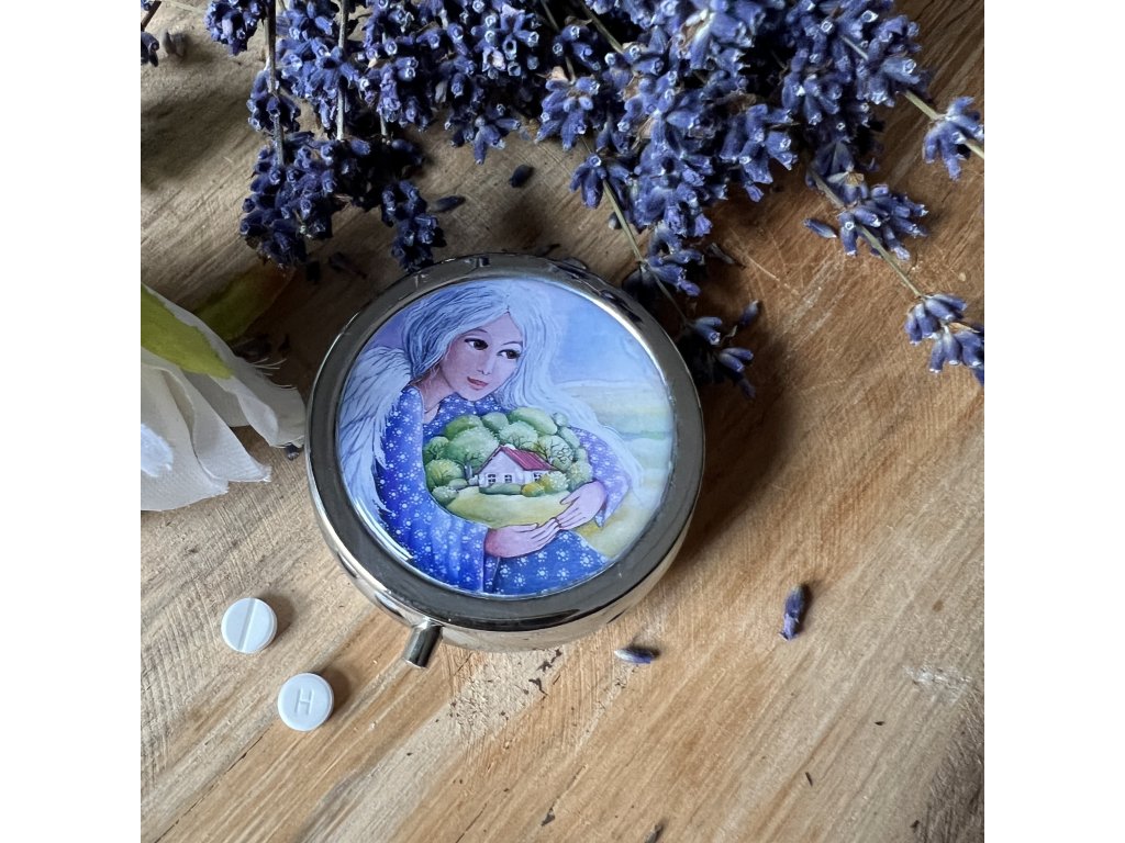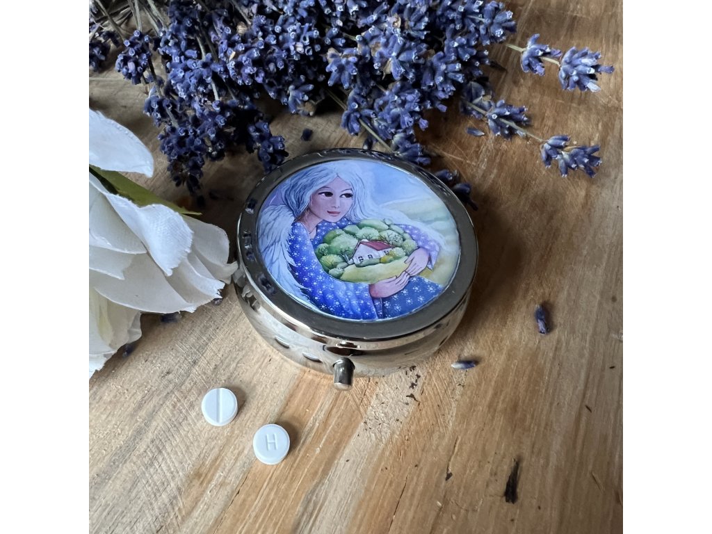 Milá krabiččka , lékovka s obrázkem ..na léky na vitamíny .. do kabelky - milá praktická drobnost která potěší...V organzovém pytlíčku.
