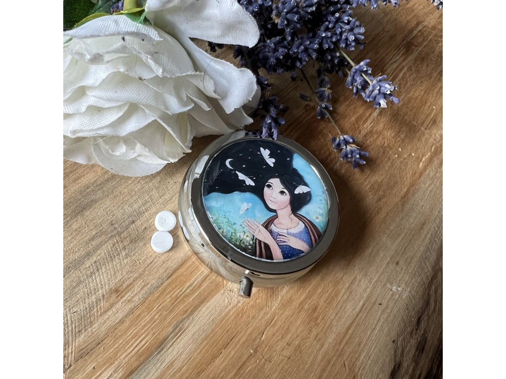 Milá krabiččka , lékovka s obrázkem ..na léky na vitamíny .. do kabelky - milá praktická drobnost která potěší...V organzovém pytlíčku.