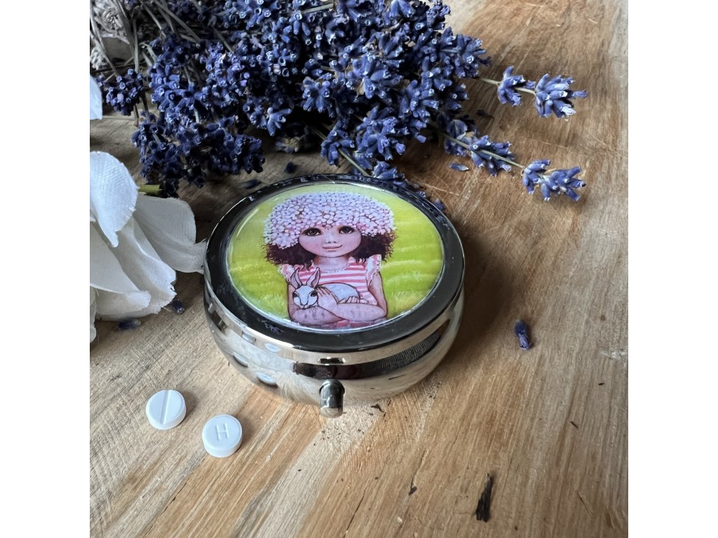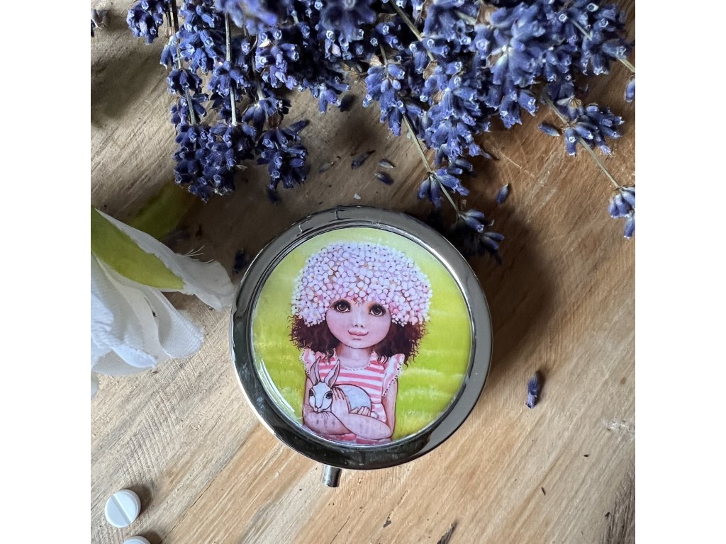 Milá krabiččka , lékovka s obrázkem ..na léky na vitamíny .. do kabelky - milá praktická drobnost která potěší...V organzovém pytlíčku.