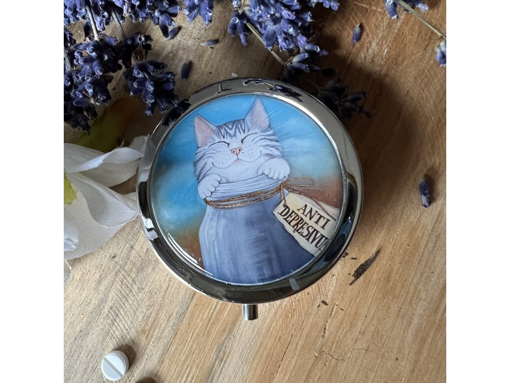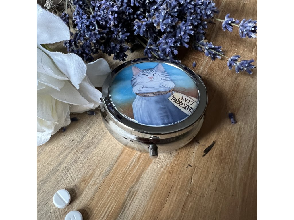 Milá krabiččka , lékovka s obrázkem ..na léky na vitamíny .. do kabelky - milá praktická drobnost která potěší...V organzovém pytlíčku.