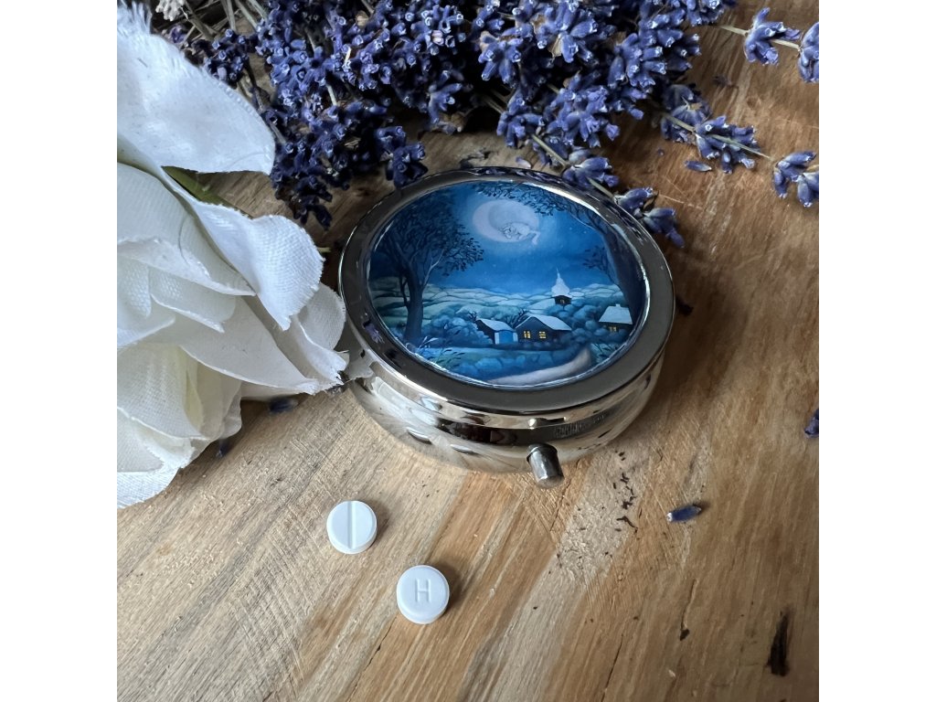 Milá krabiččka , lékovka s obrázkem ..na léky na vitamíny .. do kabelky - milá praktická drobnost která potěší...V organzovém pytlíčku.