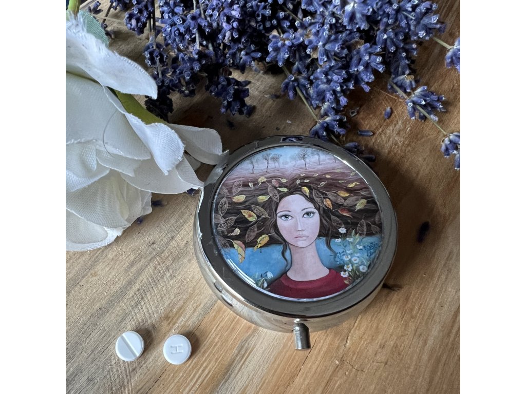 Milá krabiččka , lékovka s obrázkem ..na léky na vitamíny .. do kabelky - milá praktická drobnost která potěší...V organzovém pytlíčku.
