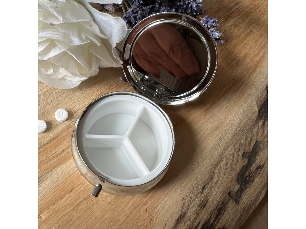 Malá krabička na léky s mechanickým zavíráním. Uvnitř rozdělaná na tři přihrádky - třeba ráno, poledne, večer..