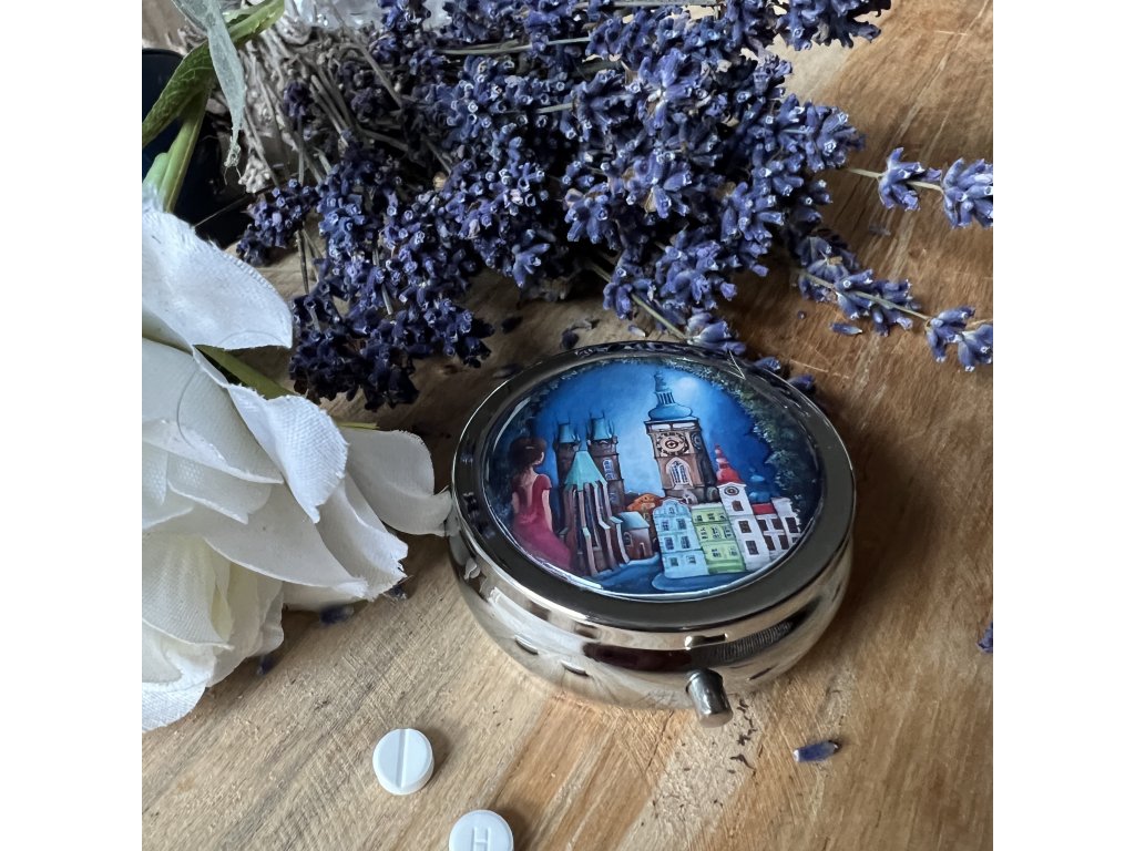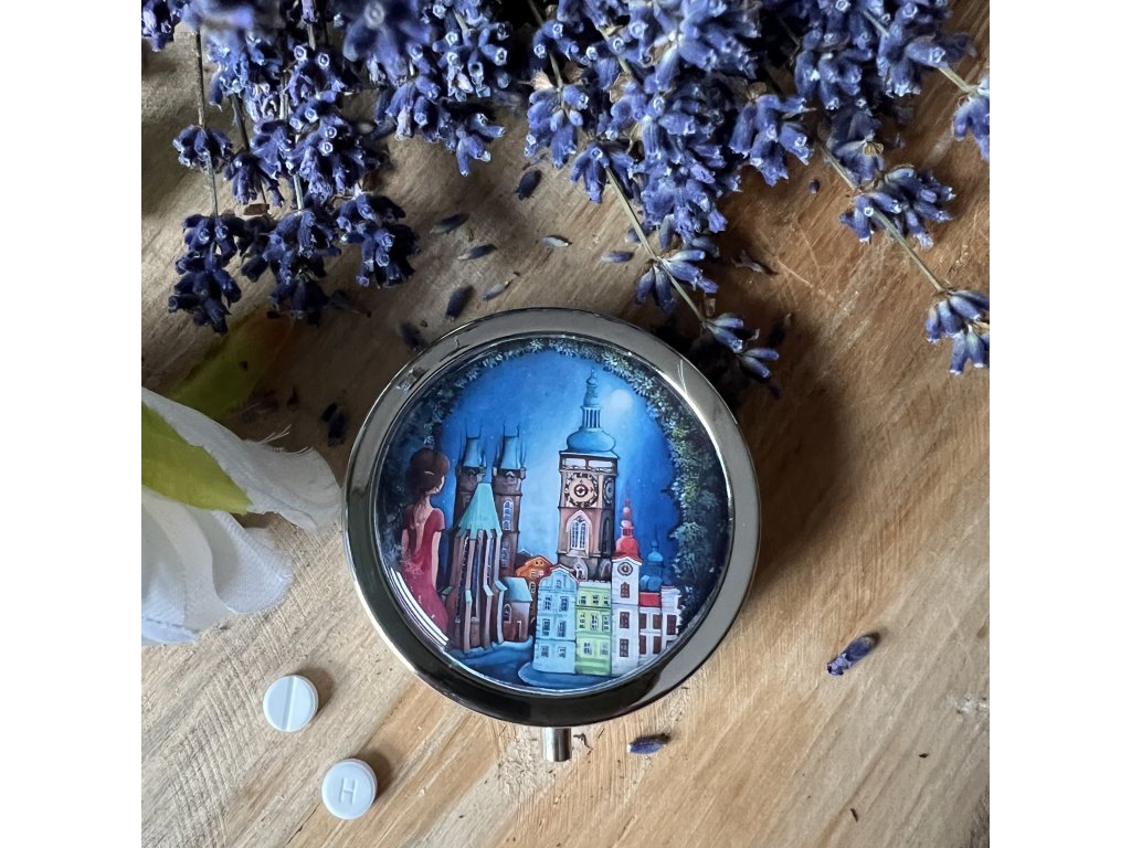 Milá krabiččka , lékovka s obrázkem ..na léky na vitamíny .. do kabelky - milá praktická drobnost která potěší...V organzovém pytlíčku.