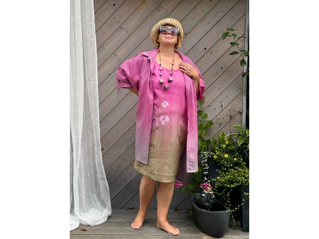 Materiál je krásný český len, ručně barvený reaktivními barvami která barví vláknou uvnitř , neobaluje ho tak drží výborně. Ještě se Vám vyplaví nějaká nedokonale vymáchaná barva, ale pak již barvit nebude. Malovala jsem já pracně a s láskou tak je košile podepsaná, abyste věděli ,že nosíte originál .