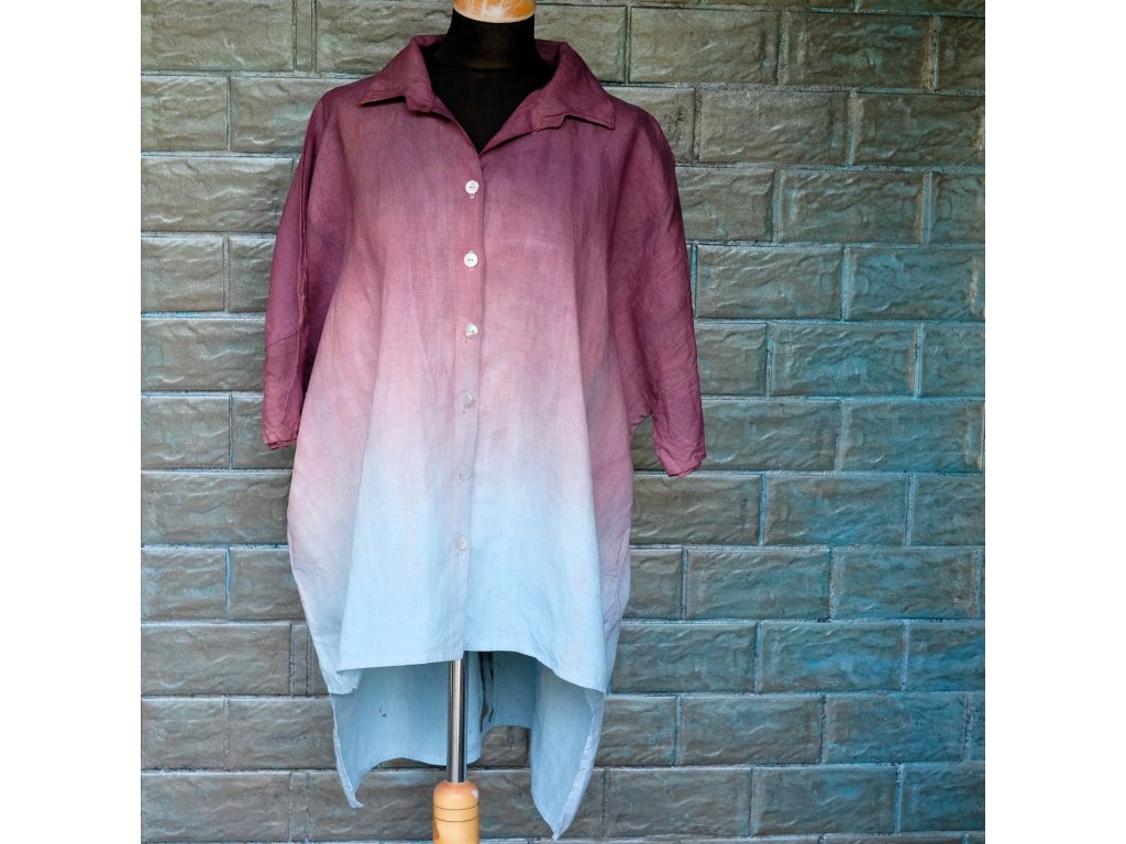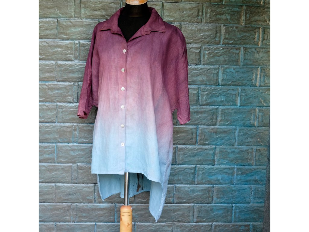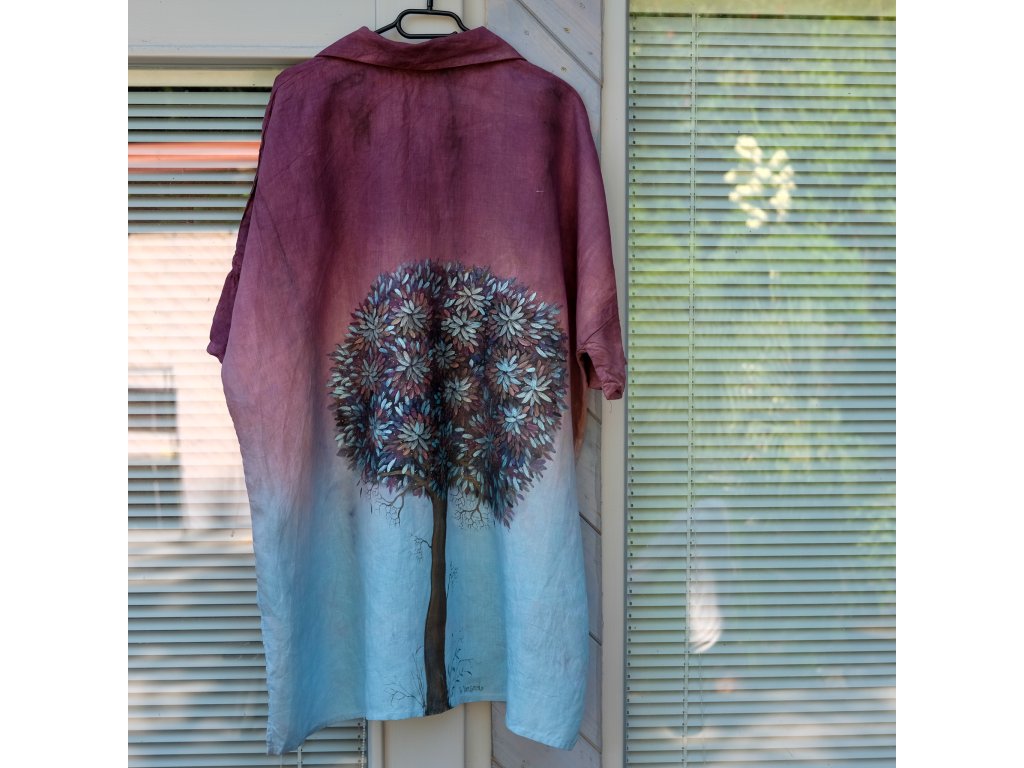 Materiál je krásný český len, ručně barvený reaktivními barvami která barví vláknou uvnitř , neobaluje ho tak drží výborně. Ješět se Vám vyplaví nějaká nedokonale vymáchaná barva , ale pak již barvit nebude. Malovala jsem já prascně a sláskou tak je košile podepsaná, abyste věděli ,že nosíte originál .