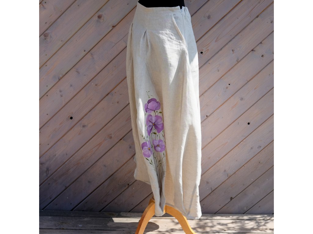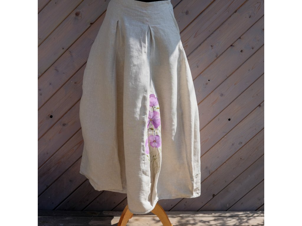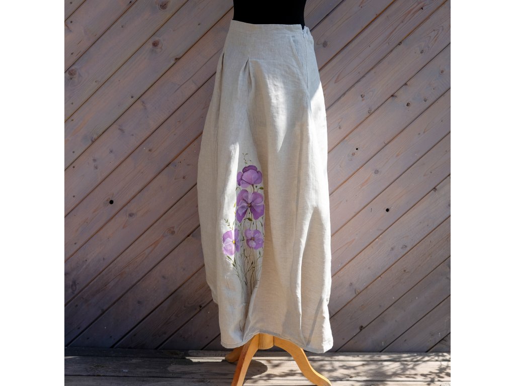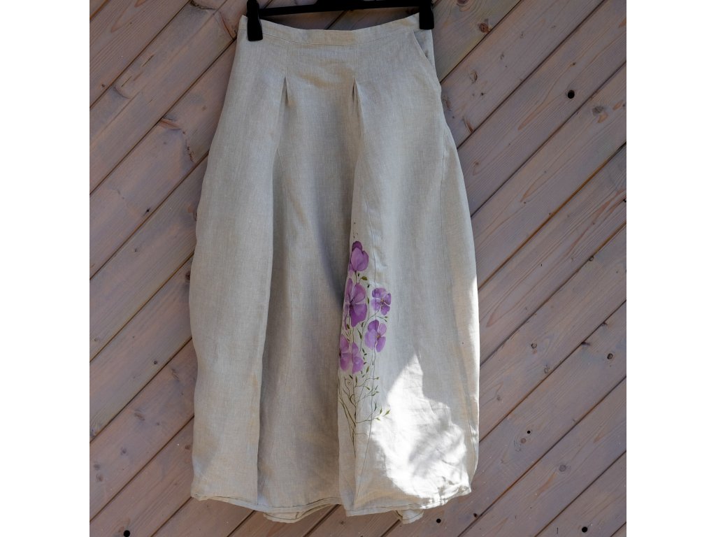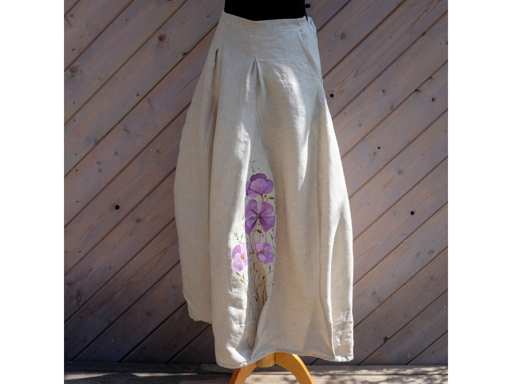 Sukně je ušitá do pevného pasu, zapínání na zip. Dvě klínové kapsy (jako u riflí). V horní díly jsou prošité sklady což doopravdy nádherně sedí a sluší.