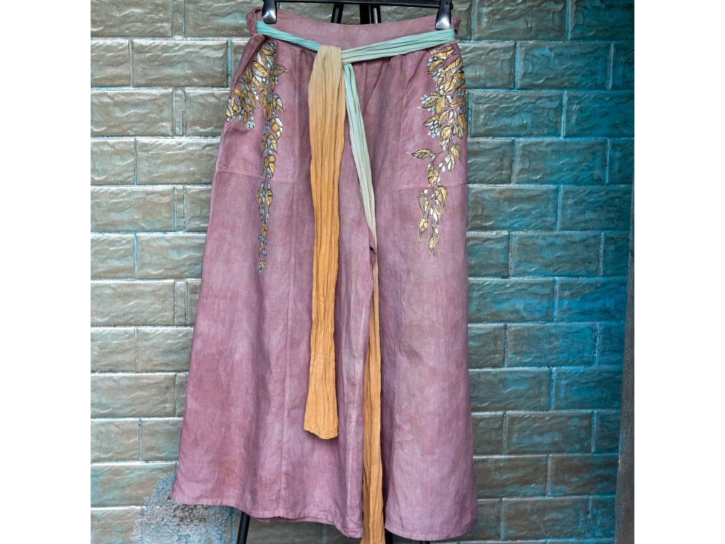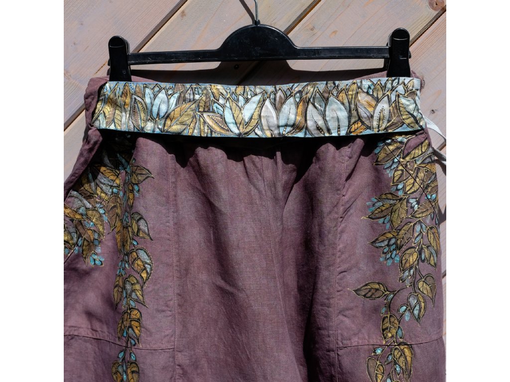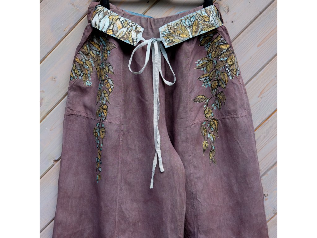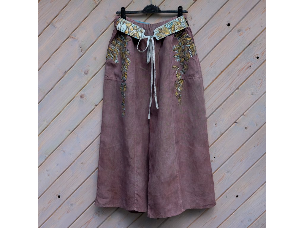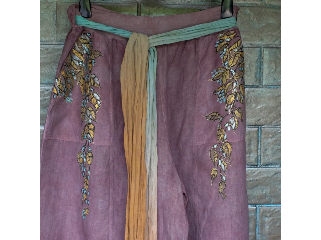 Kalhoty jsou v pase do pružného nápletu a uvnitř mají gumu, mají poutka na malovaný pásek nebo barvený šátek- oboje je součástí kalhot.