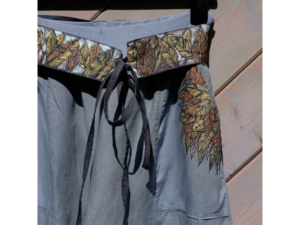 Kalhoty jsou v pase do pružného nápletu a uvnitř mají gumu, mají poutka na malovaný pásek nebo barvený šátek - oboje je součástí kalhot.