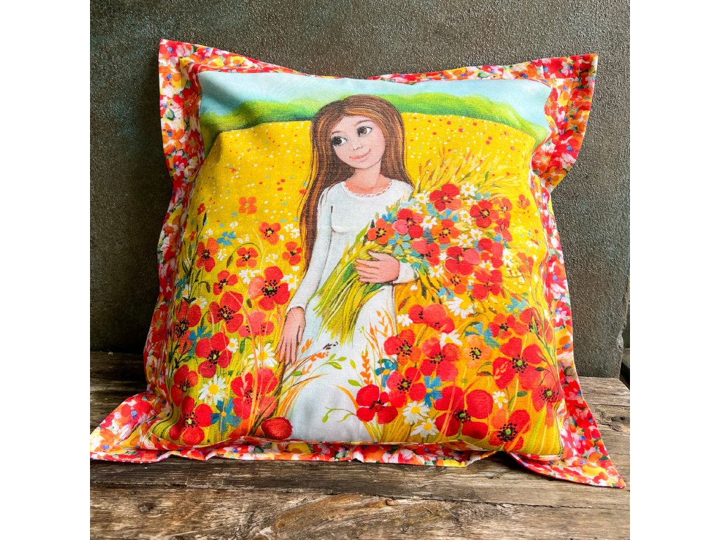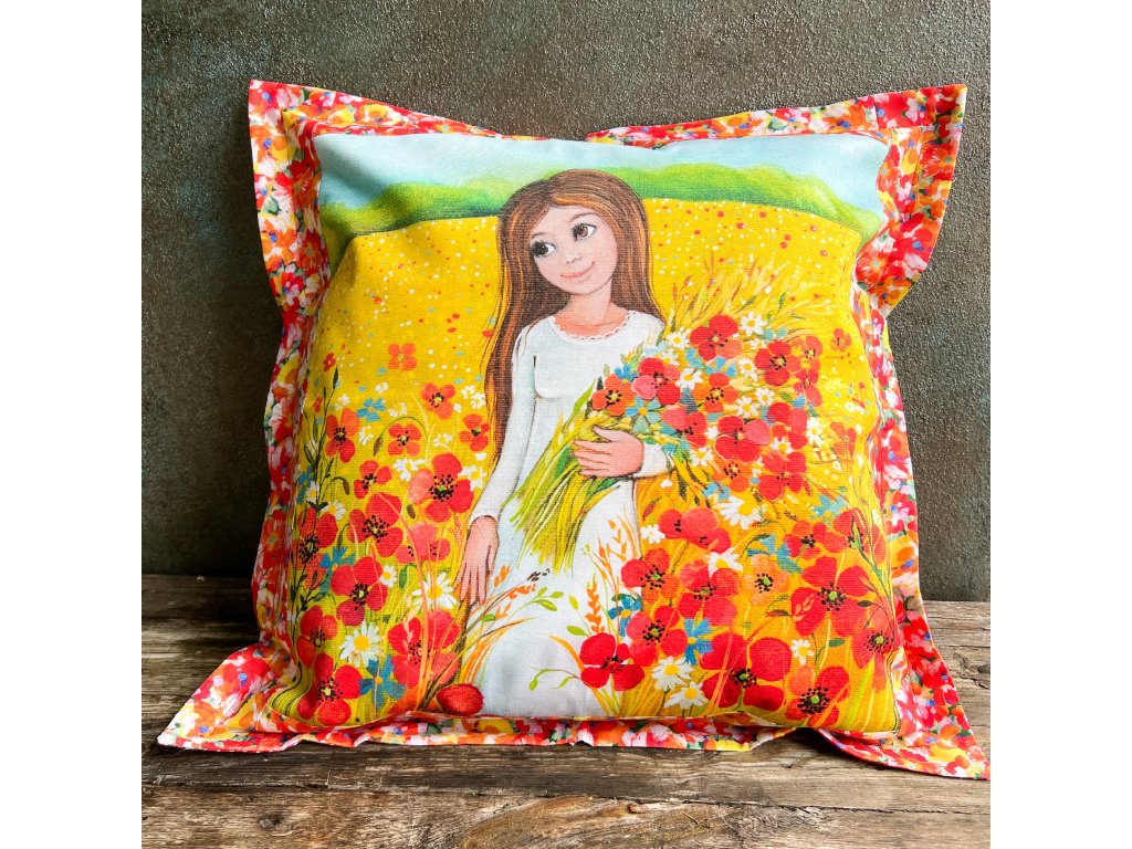 Polštář je ušitá z mé látky kterou jsem si nechala vytisknout. Velikost obrázku je 40 x 40 cm okolo je ozdobný okraj z amerických designových látek. Přední strana je podložená termolínem. Potah na zip.