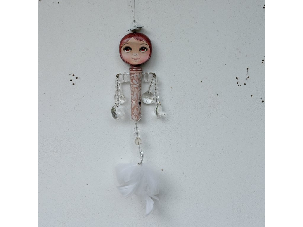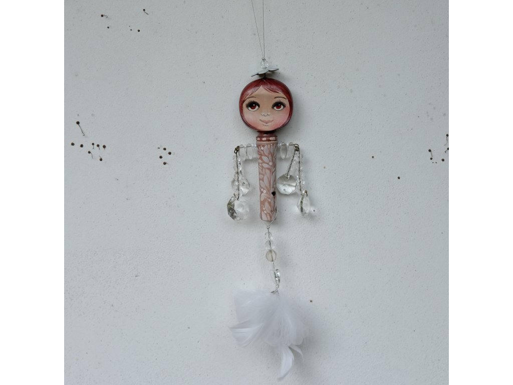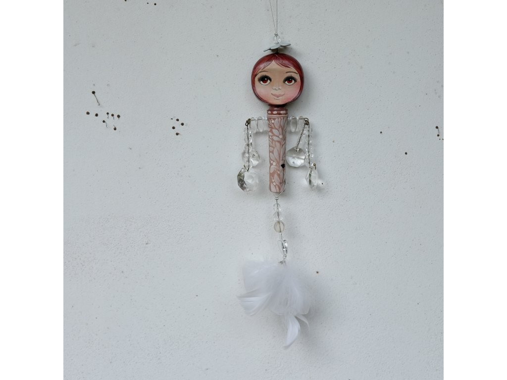 Kolíček je malovaný olejovými barvami , nalakovaný a pak zdobený korálky, českým křištálem, peříčky a motýle mají křidélka z peří krásně ozdobená..