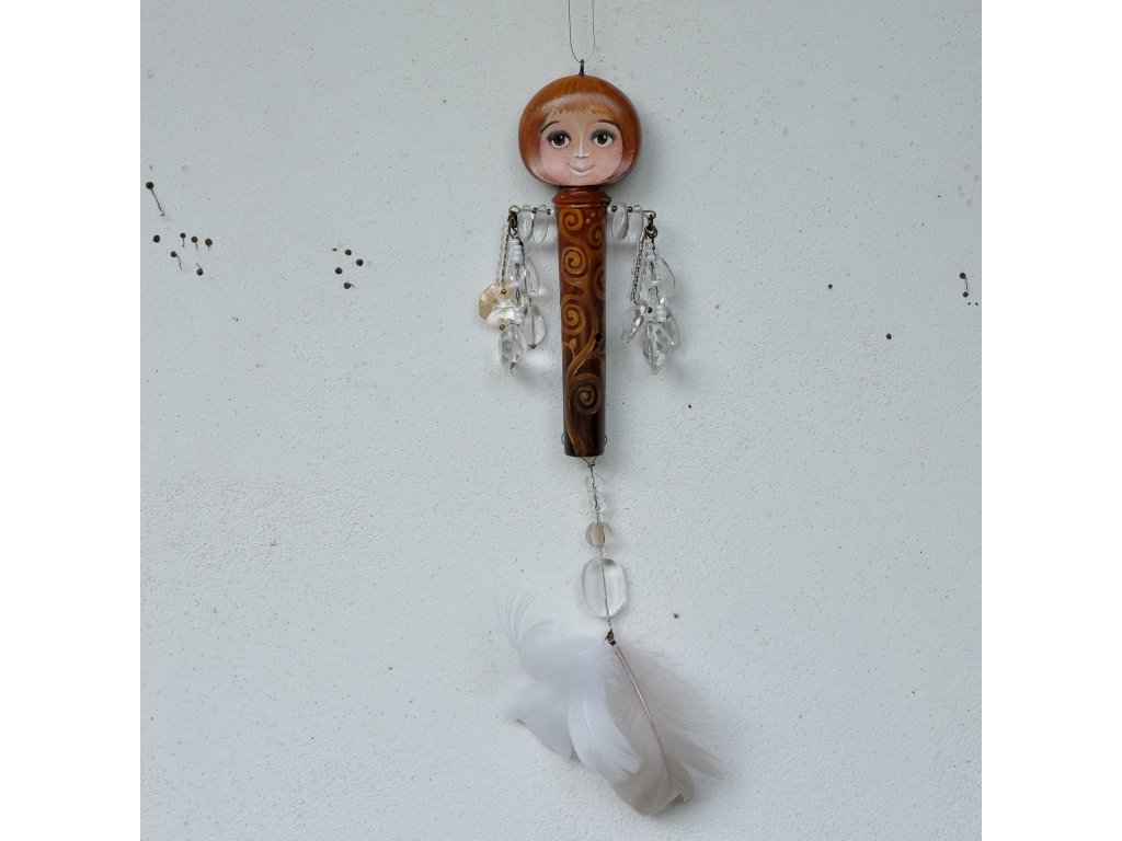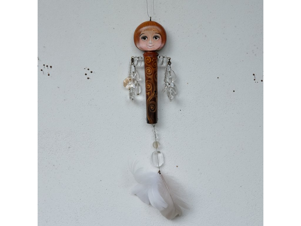 Kolíček je malovaný olejovými barvami , nalakovaný a pak zdobený korálky, českým křištálem, peříčky a motýle mají křidélka z peří krásně ozdobená..