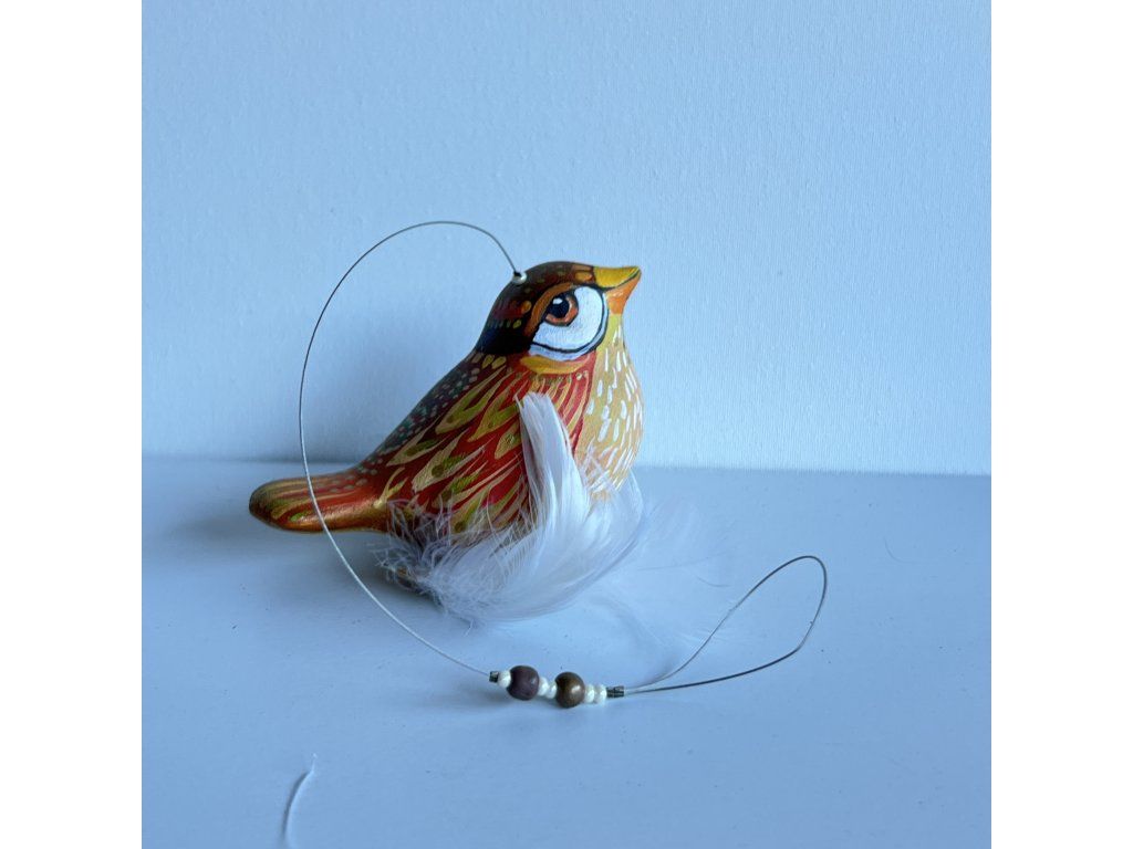 Krásný ptáček mnou ručně malovaný, zářivý krásnými barvami. Zavěšený na slabounkém ale pevném lanku a  ozdobený skleněnými blýskavými korálky a  peříčky.