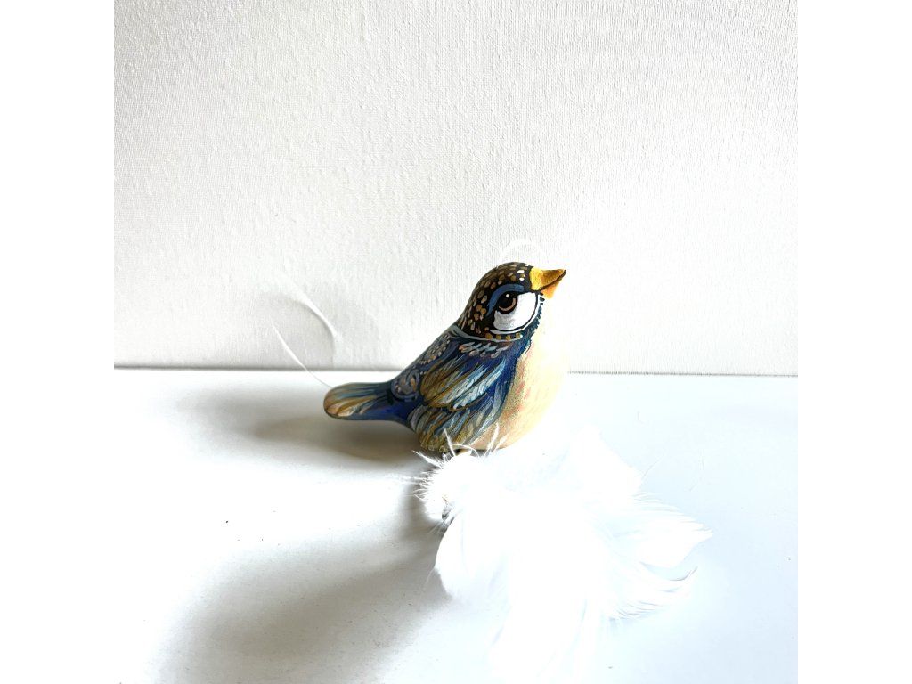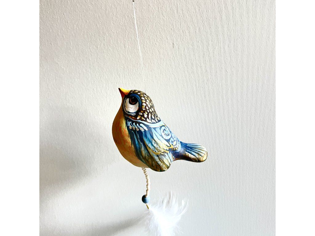 Krásný ptáček mnou ručně malovaný, zářivý krásnými barvami. Zavěšený na slabounkém ale pevném lanku a  ozdobený skleněnými blýskavými korálky a  peříčky.