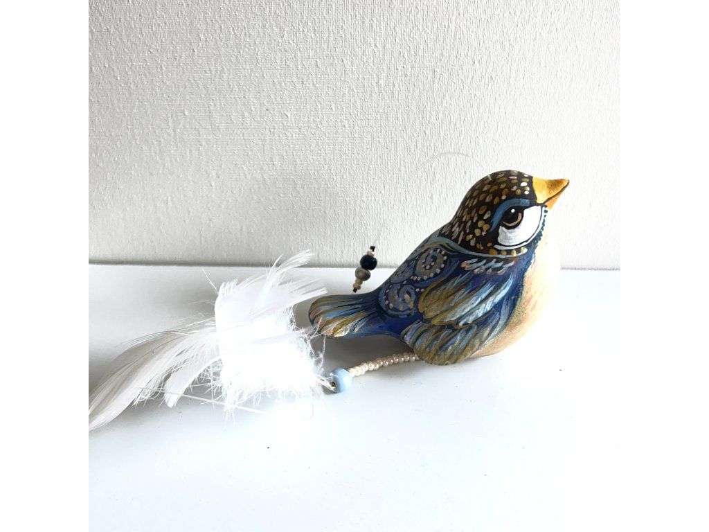 Krásný ptáček mnou ručně malovaný, zářivý krásnými barvami. Zavěšený na slabounkém ale pevném lanku vlasci a  ozdobený skleněnými blýskavými korálky a  peříčky.