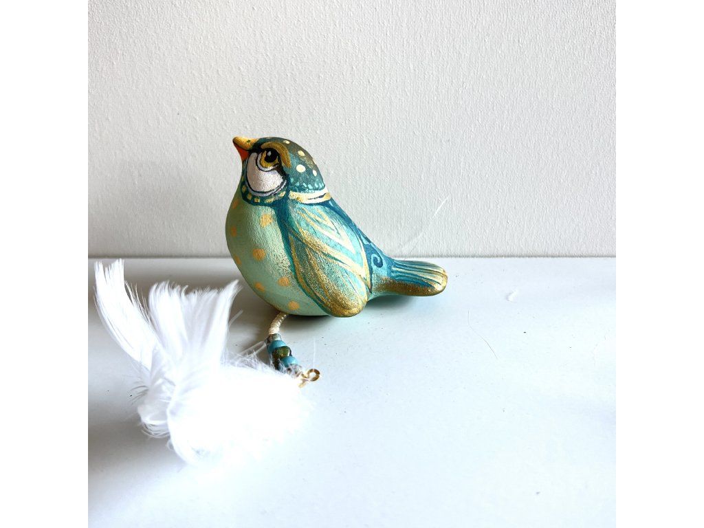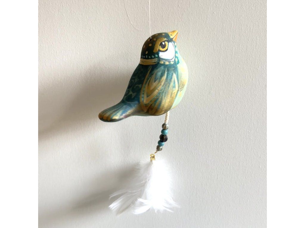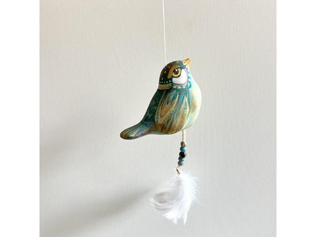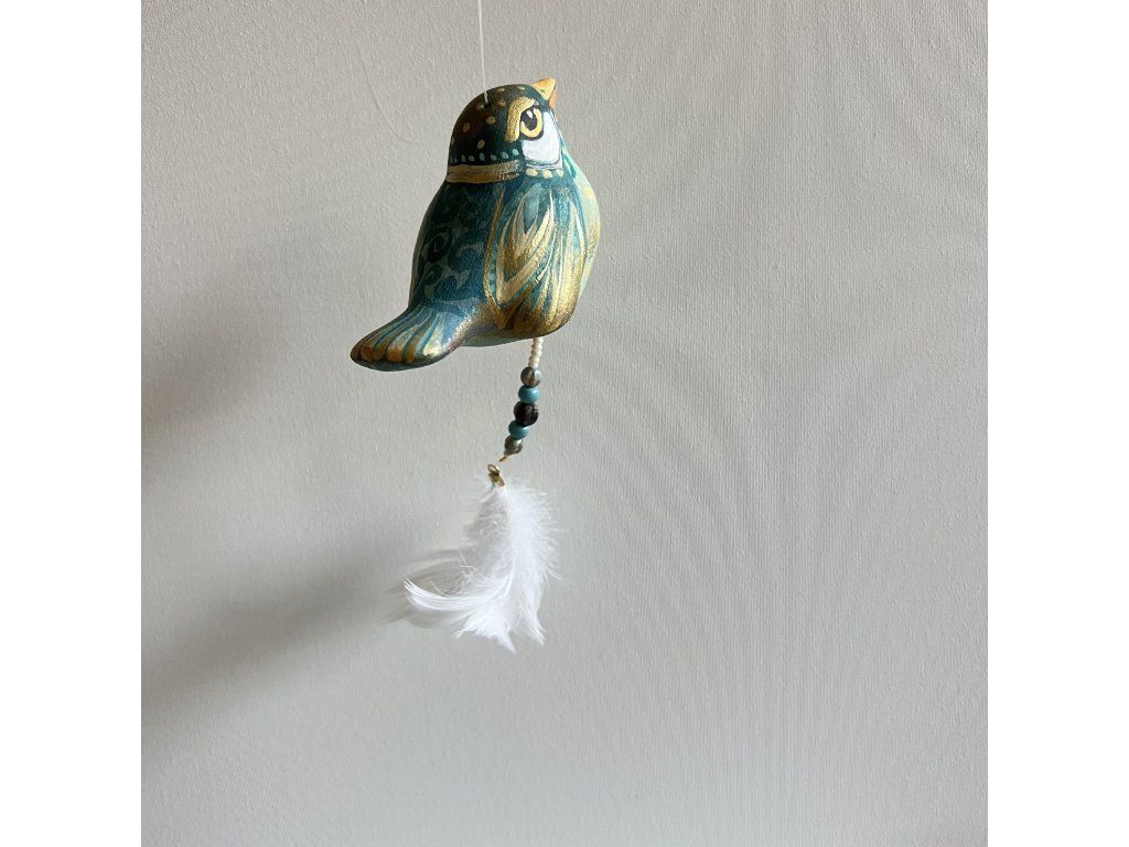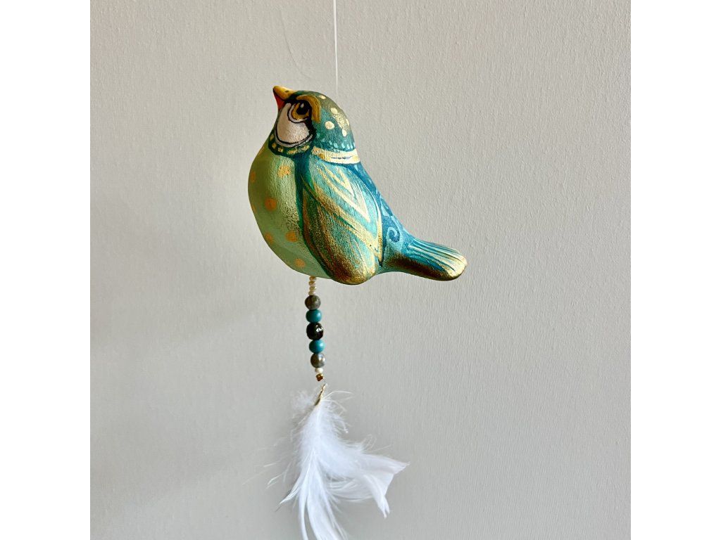 Krásný ptáček mnou ručně malovaný, zářivý krásnými barvami. Zavěšený na slabounkém ale pevném lanku a ozdobený skleněnými blýskavými korálky a peříčky.