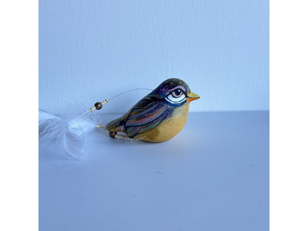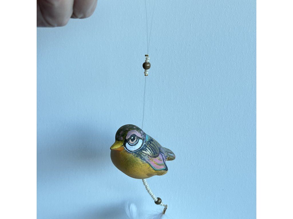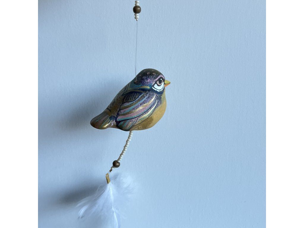 Krásný ptáček mnou ručně malovaný, zářivý krásnými barvami. Zavěšený na slabounkém ale pevném lanku a  ozdobený skleněnými blýskavými korálky a  peříčky.