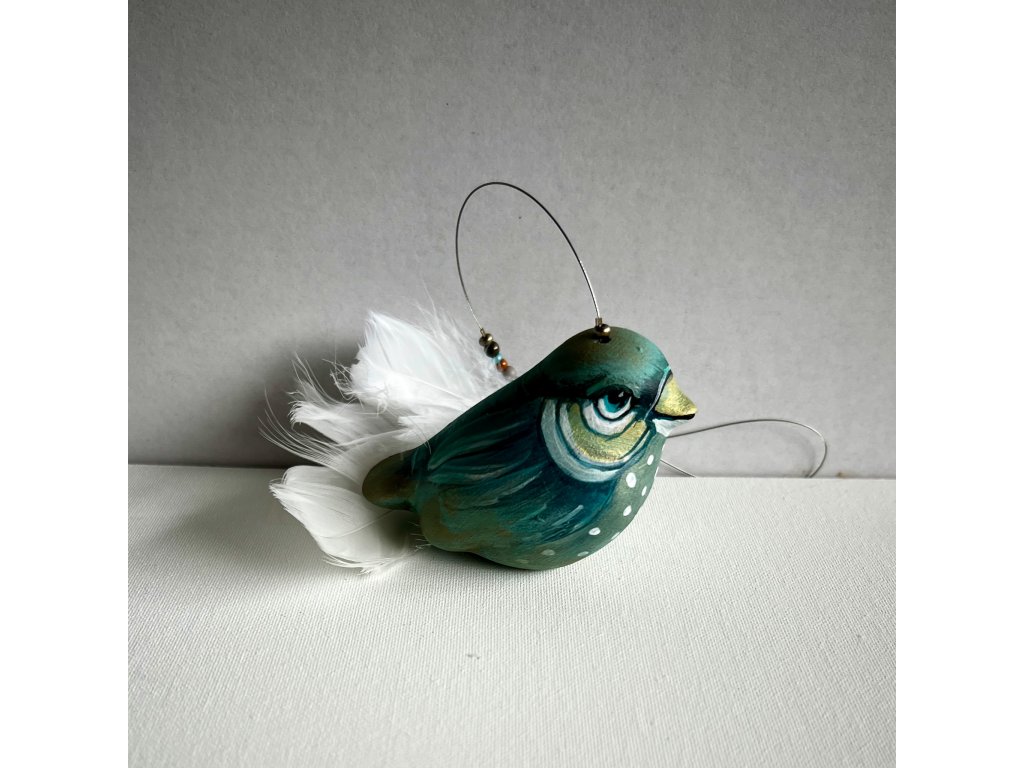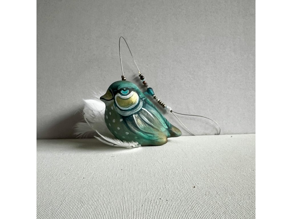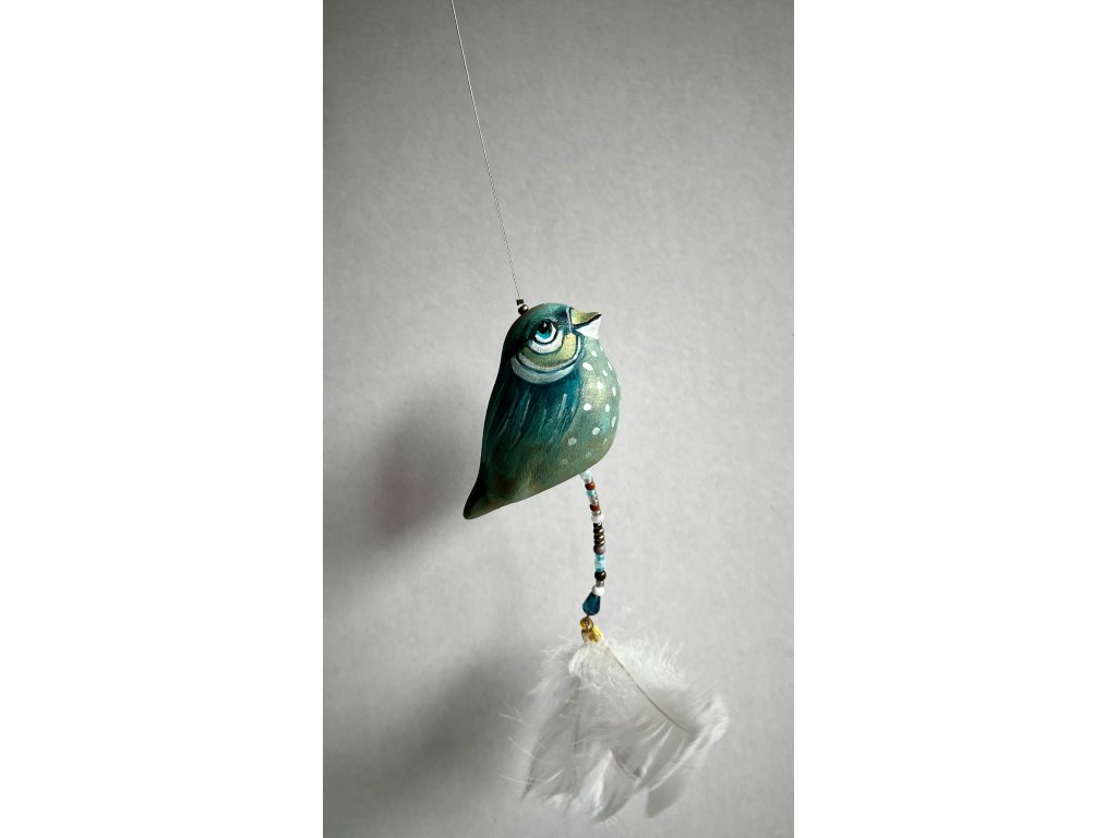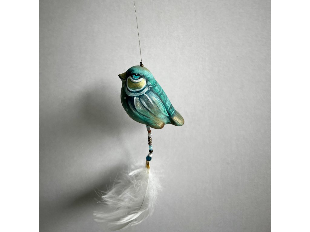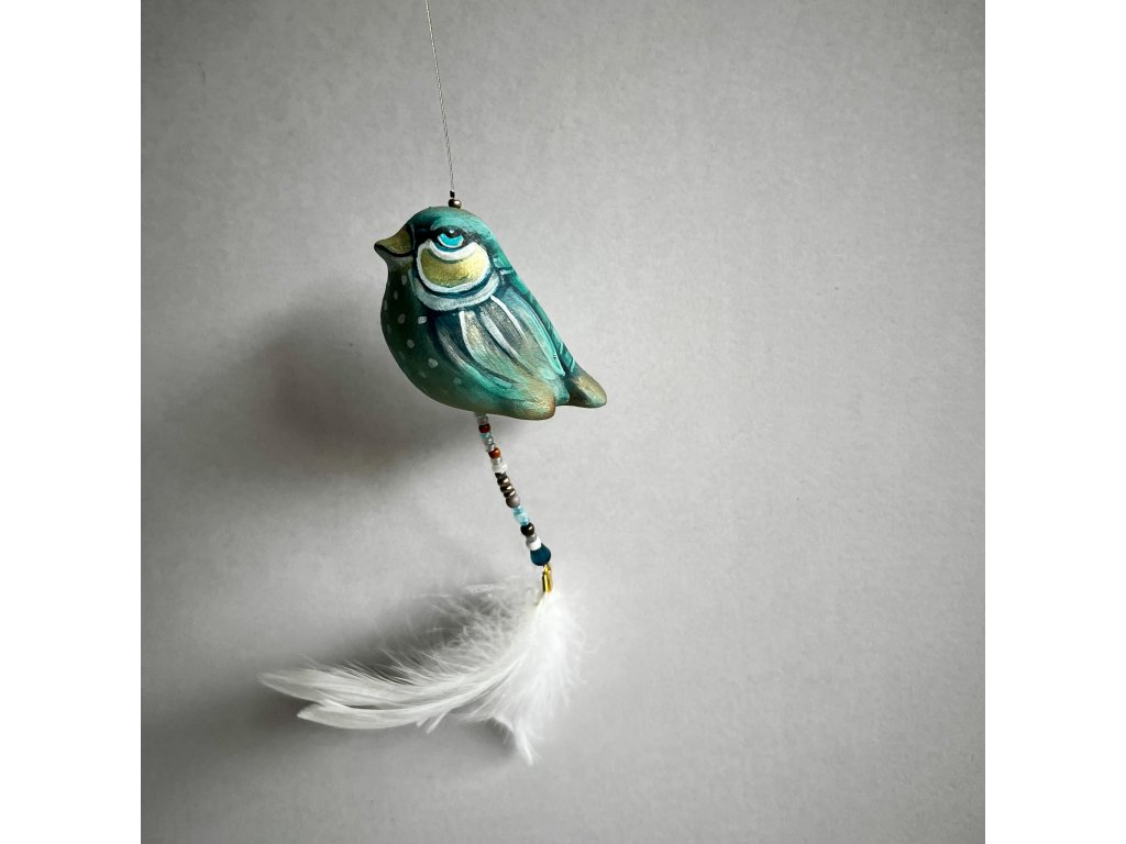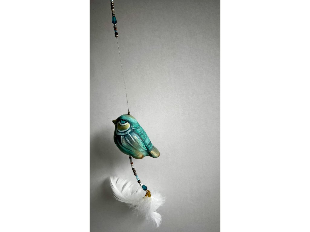 Krásný ptáček mnou ručně malovaný, zářivý krásnými barvami. Zavěšený na slabounkém ale pevném lanku a ozdobený skleněnými blýskavými korálky a peříčky.