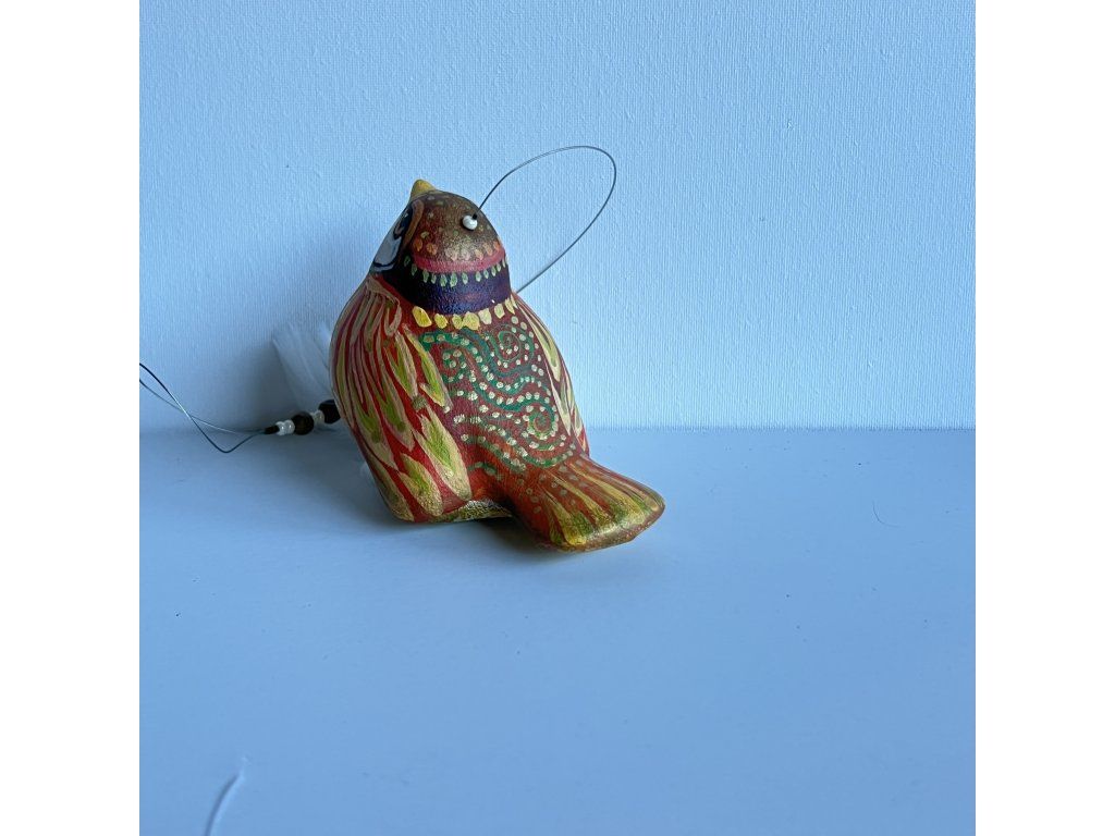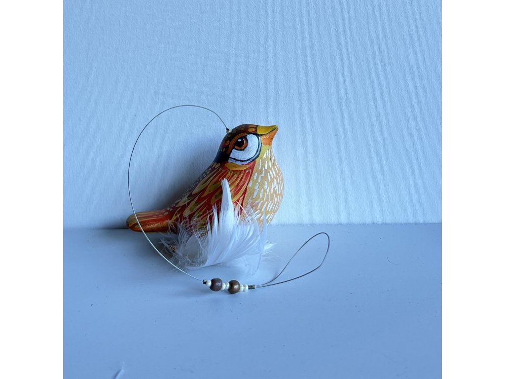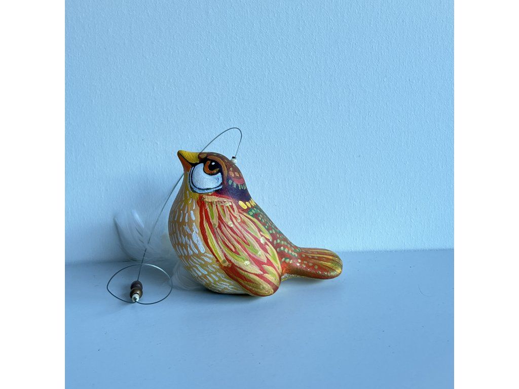 Krásný ptáček mnou ručně malovaný, zářivý krásnými barvami. Zavěšený na slabounkém ale pevném lanku vlasci a  ozdobený skleněnými blýskavými korálky a  peříčky.