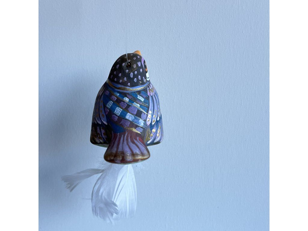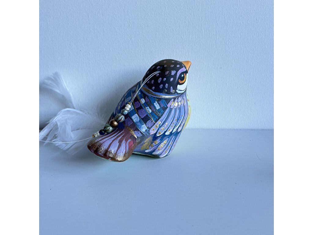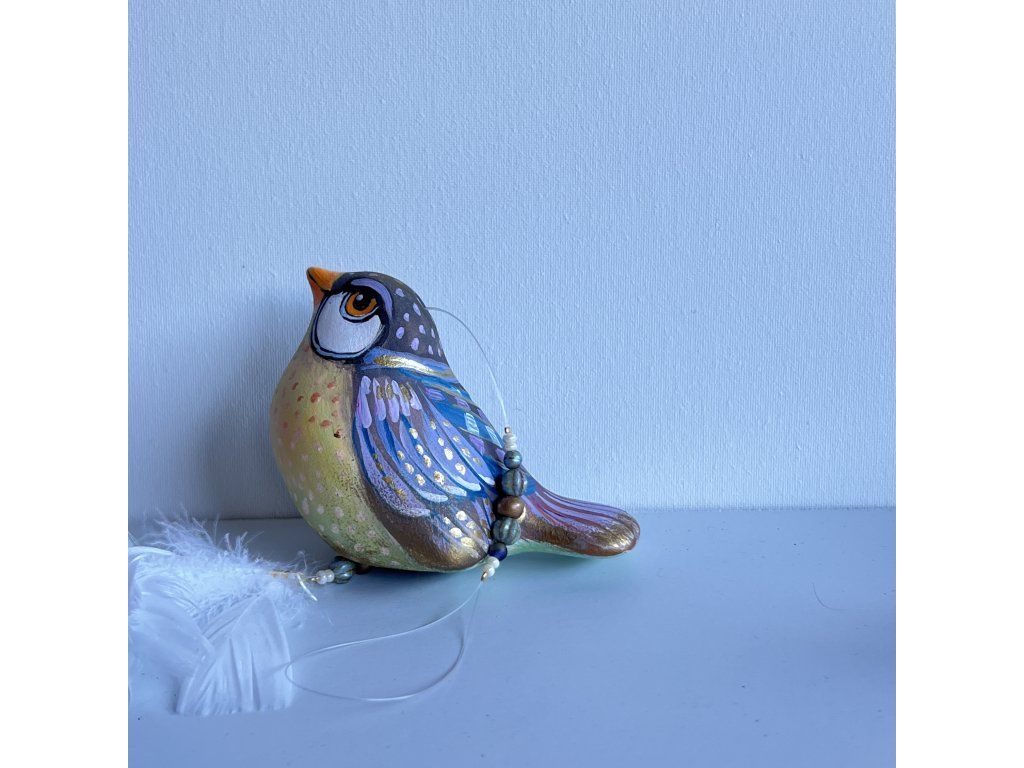 Krásný ptáček mnou ručně malovaný, zářivý krásnými barvami. Zavěšený na slabounkém ale pevném lanku a  ozdobený skleněnými blýskavými korálky a  peříčky.