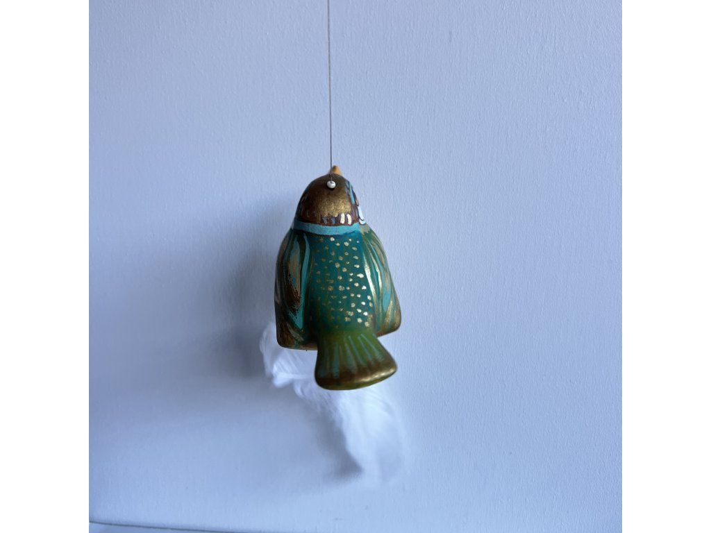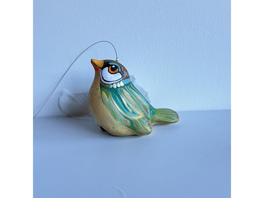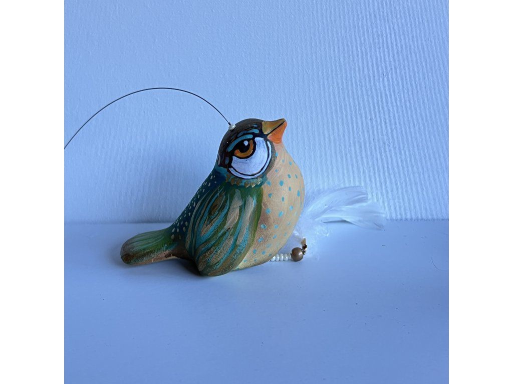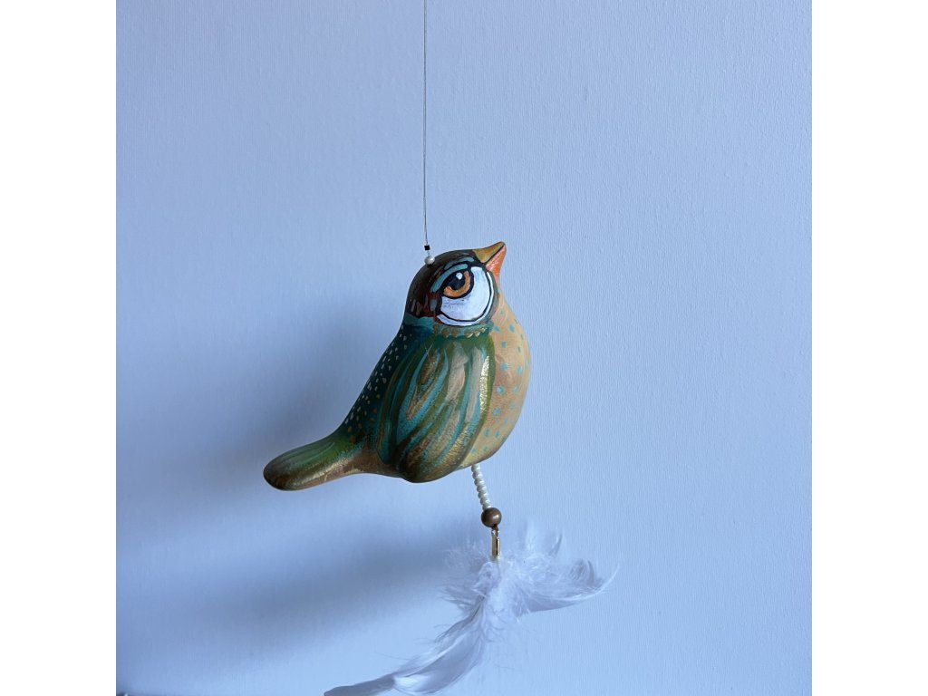 Krásný ptáček mnou ručně malovaný, zářivý krásnými barvami. Zavěšený na slabounkém ale pevném lanku a  ozdobený skleněnými blýskavými korálky a  peříčky.