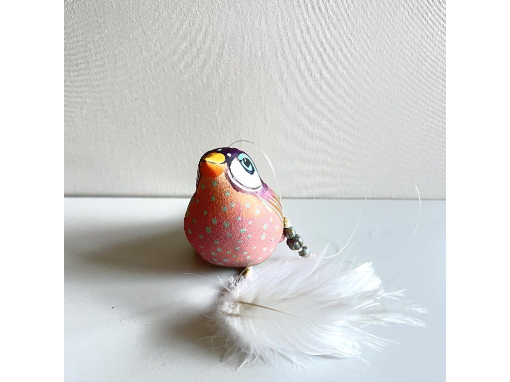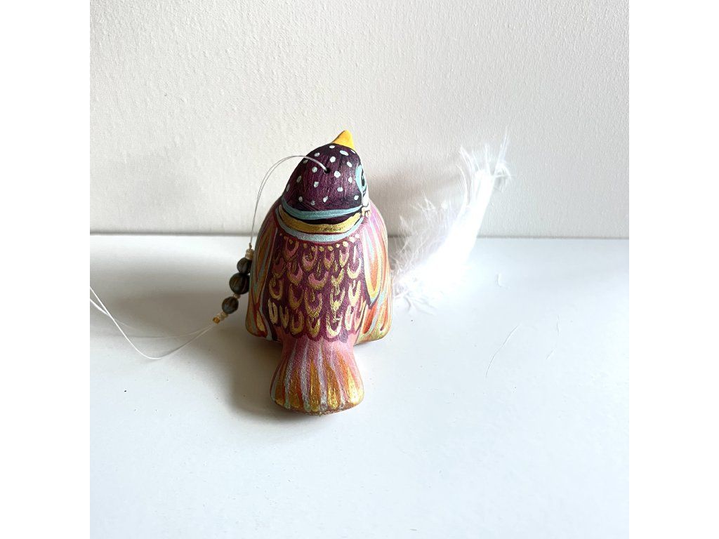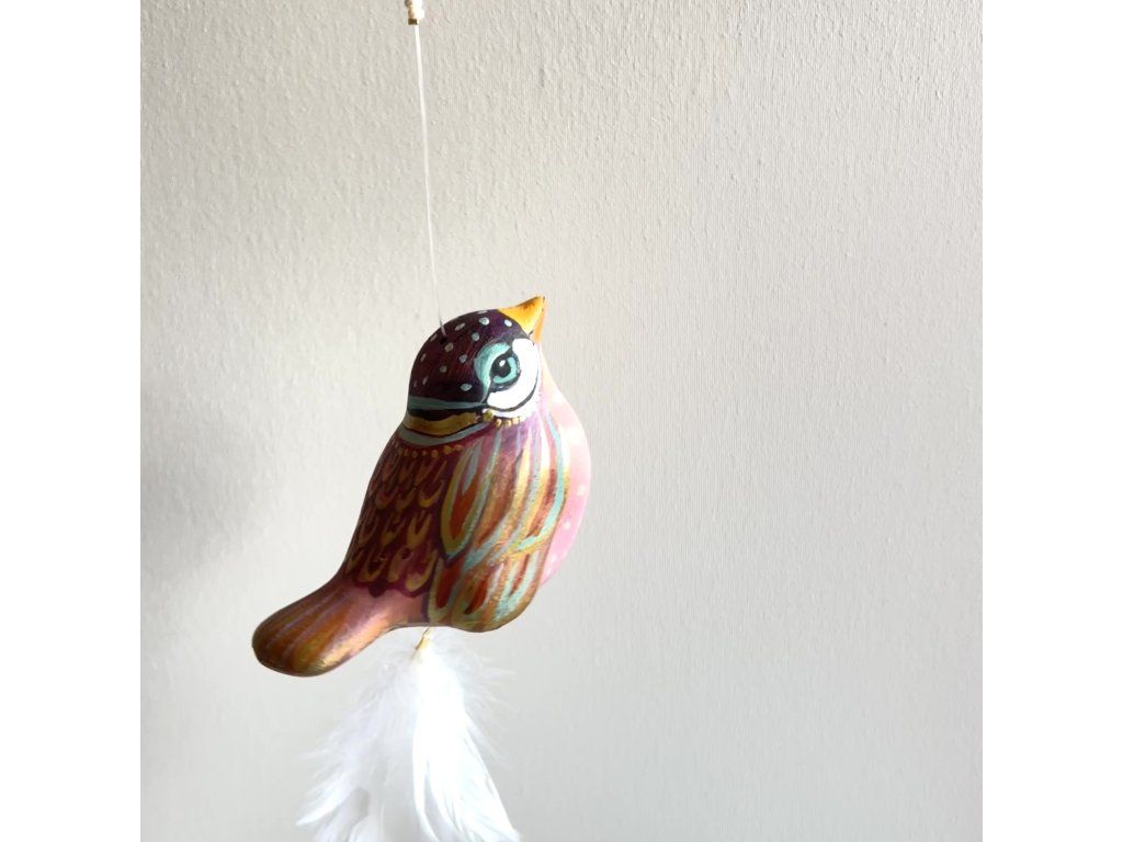 Krásný ptáček mnou ručně malovaný, zářivý krásnými barvami. Zavěšený na slabounkém ale pevném lanku a  ozdobený skleněnými blýskavými korálky a  peříčky.