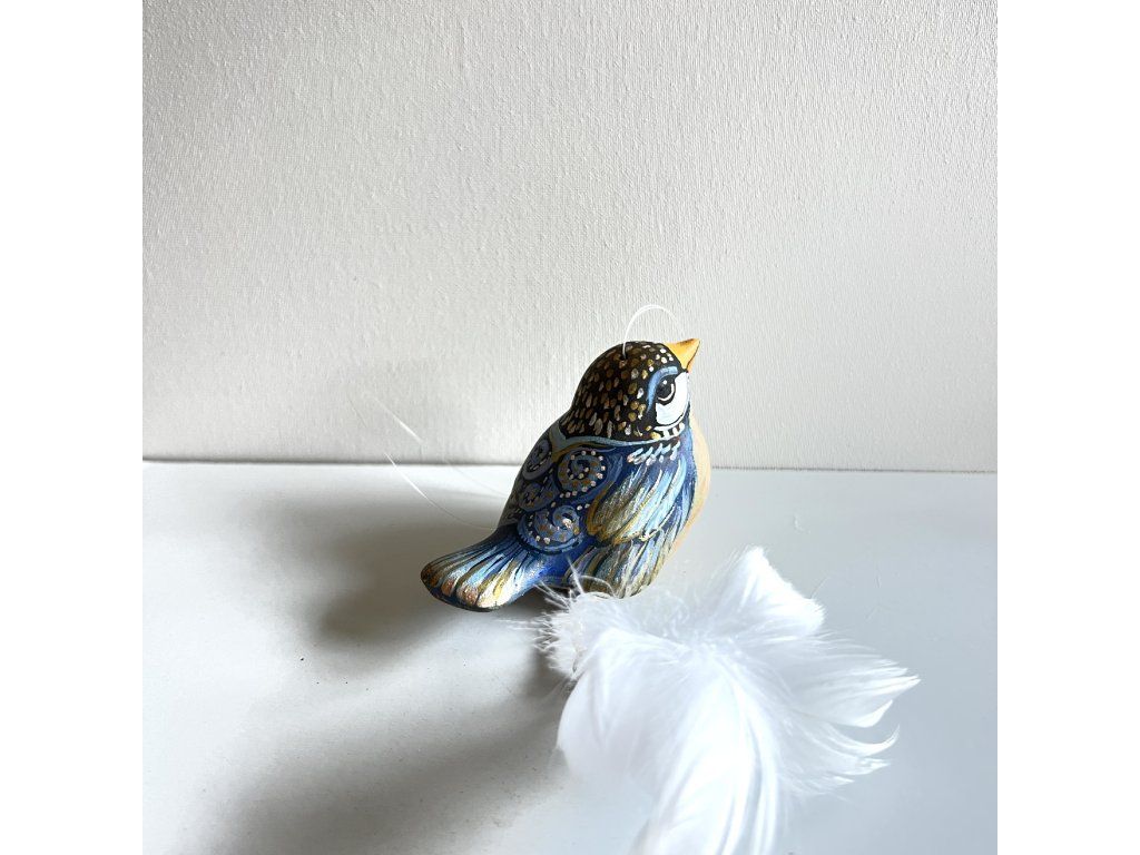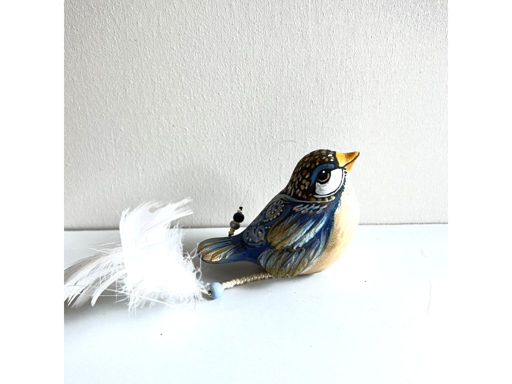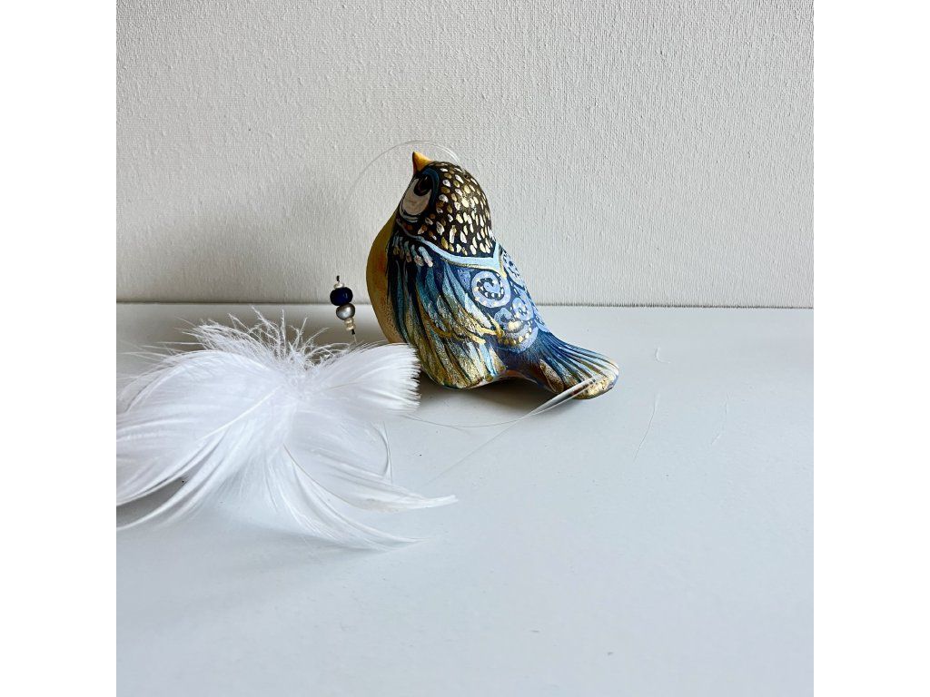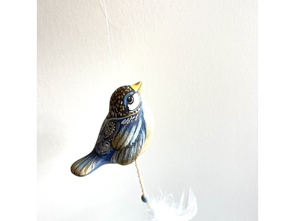 Krásný ptáček mnou ručně malovaný, zářivý krásnými barvami. Zavěšený na slabounkém ale pevném lanku a  ozdobený skleněnými blýskavými korálky a  peříčky.
