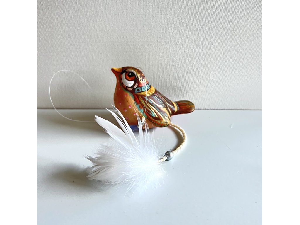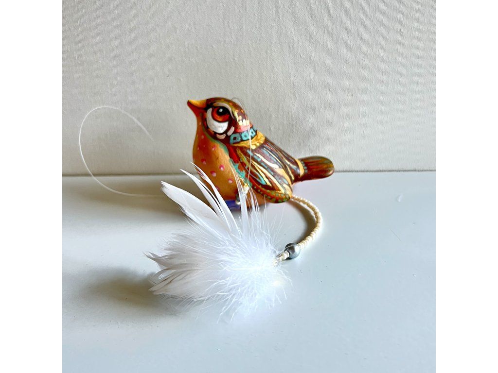 Krásný ptáček mnou ručně malovaný, zářivý krásnými barvami. Zavěšený na slabounkém ale pevném lanku vlasci a  ozdobený skleněnými blýskavými korálky a  peříčky.