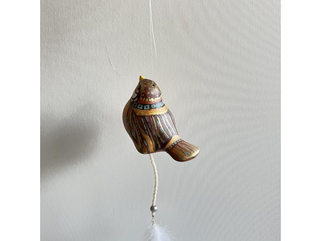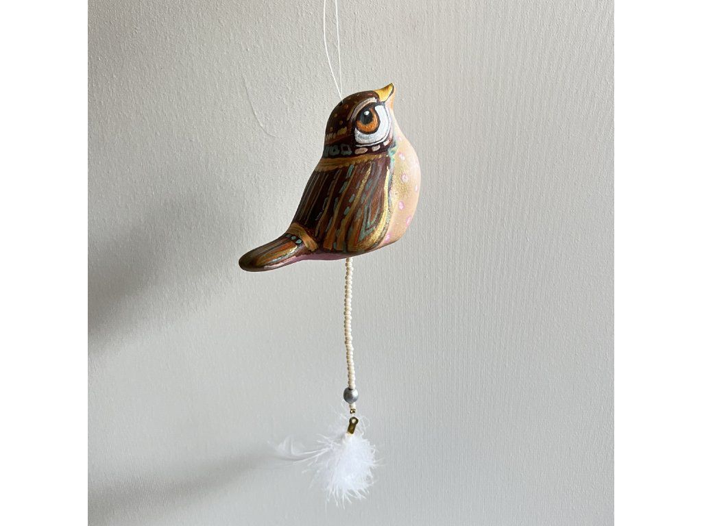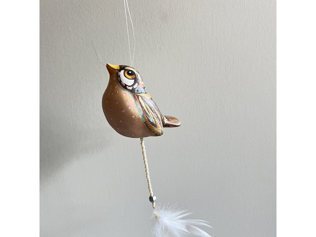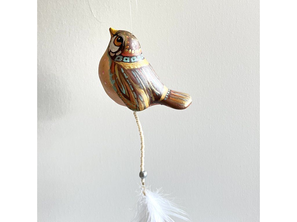 Krásný ptáček mnou ručně malovaný, zářivý krásnými barvami. Zavěšený na slabounkém ale pevném lanku a  ozdobený skleněnými blýskavými korálky a  peříčky.