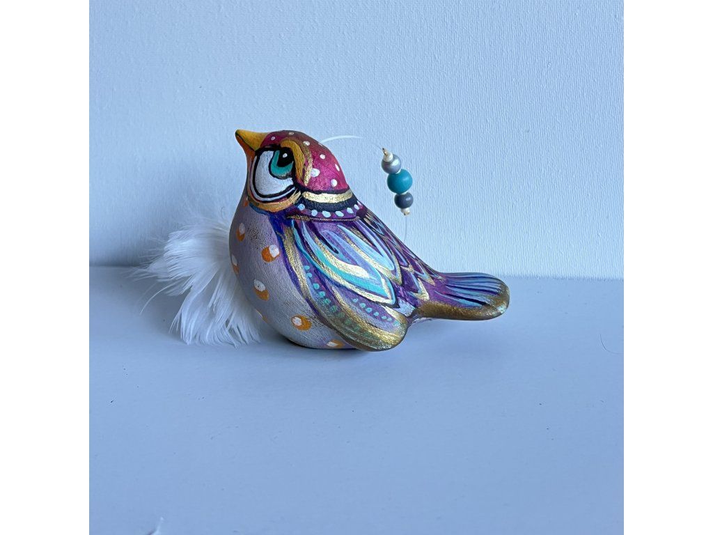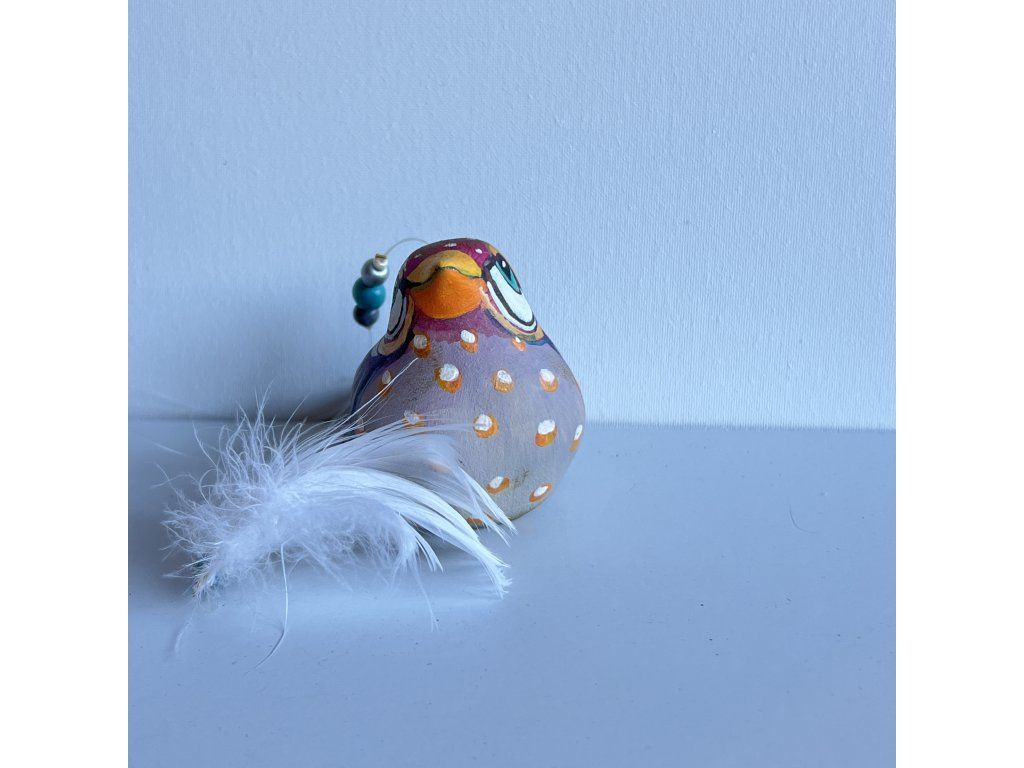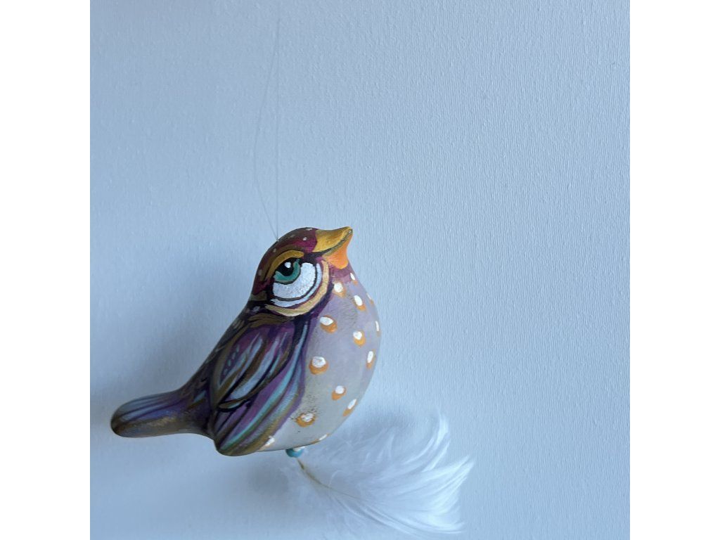 Krásný ptáček mnou ručně malovaný, zářivý krásnými barvami. Zavěšený na slabounkém ale pevném lanku vlasci a  ozdobený skleněnými blýskavými korálky a  peříčky.